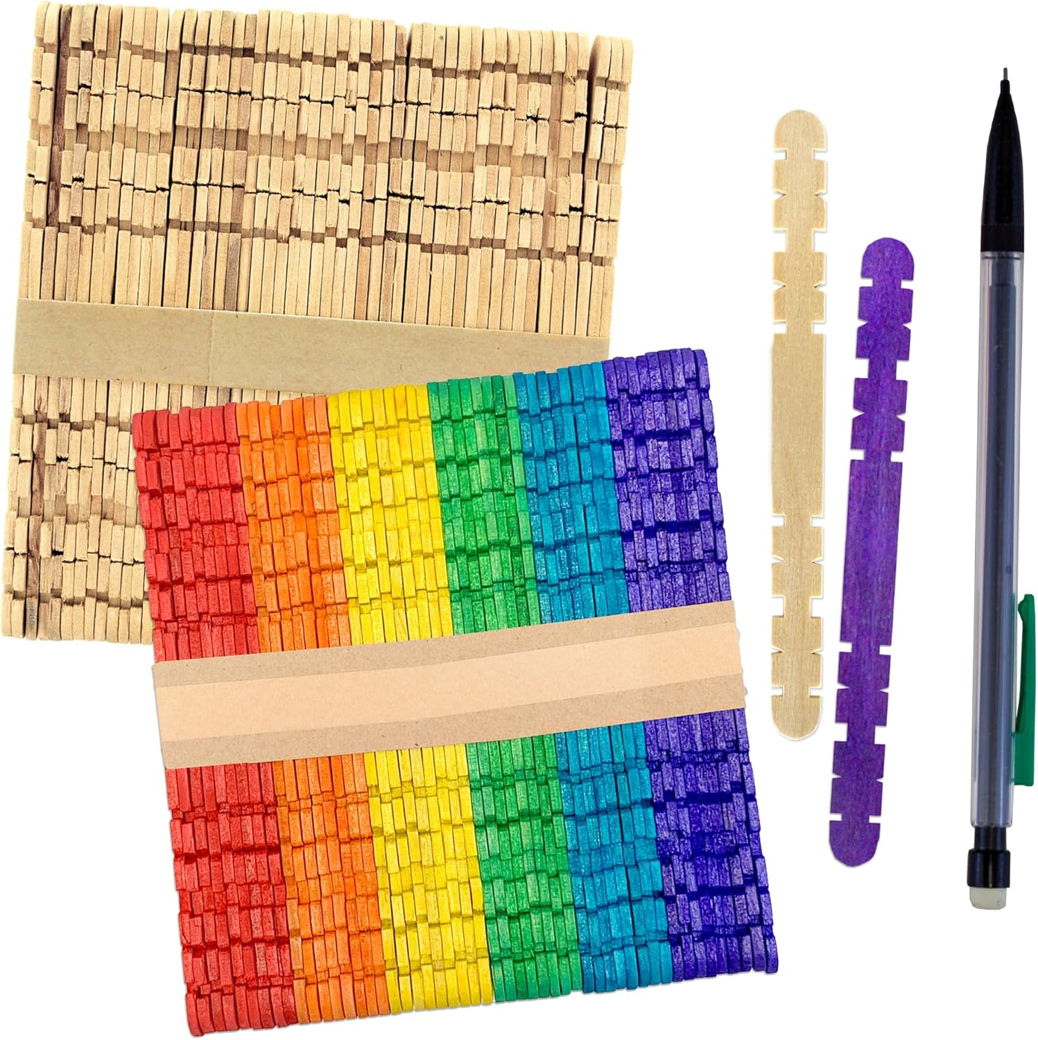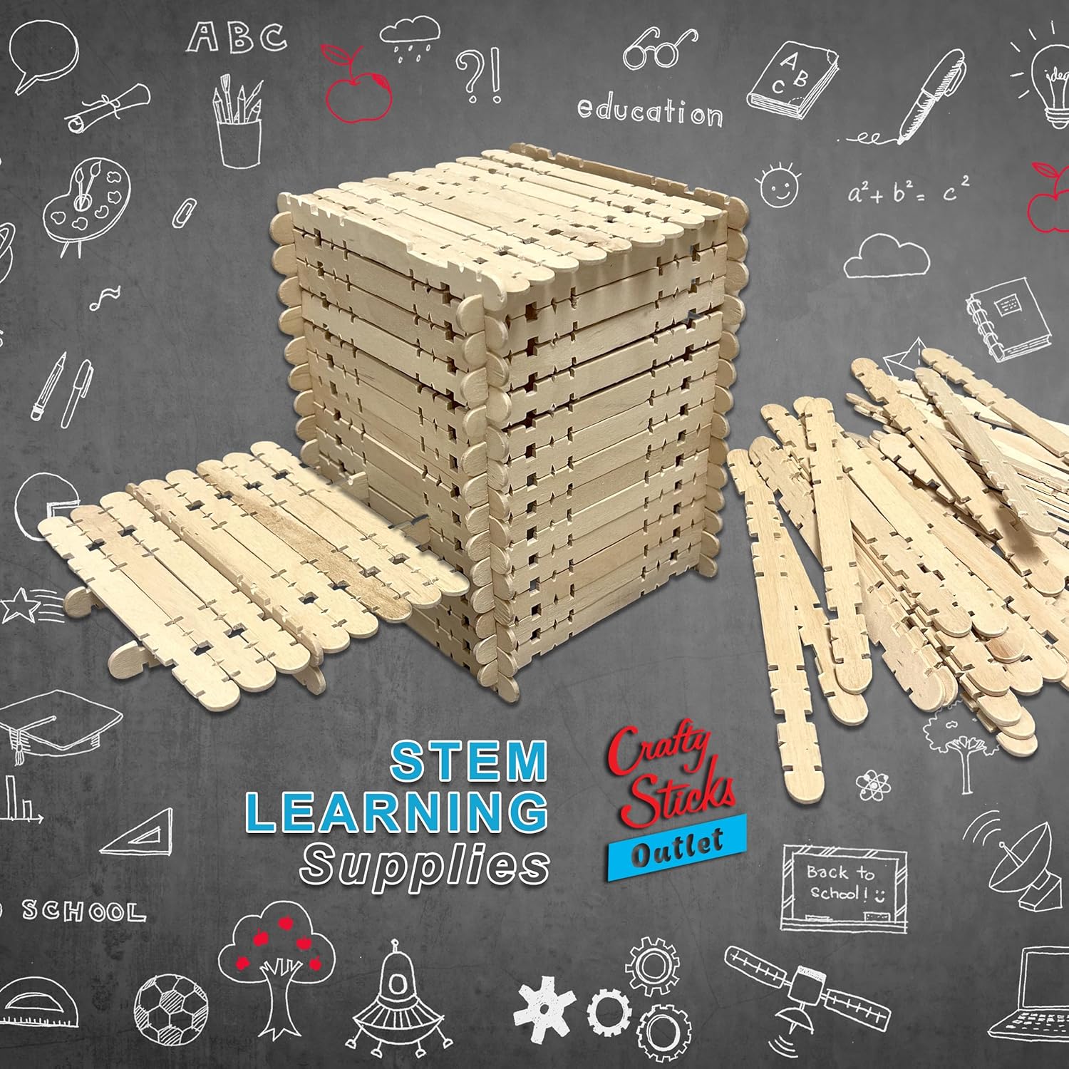 CraftySticks notched, interlocking popsicle sticks in a bulk pack of 1000 pcs. These are 4.5 inch length by 3/8 inch width flat wood sticks. Our sturdy, smooth, laser cut wood sticks are 1/6 inch (2mm) thickness. These sticks are ideal for endless creative classroom projects, STEM learning challenges, engineering and building designs, party camp and library crafts. They are made from 100% FSC Certified Birch wood, the mark of responsible forestry. This versatile craft supply is sought after by crafters, parents, teachers and students alike! Our notched craft sticks have passed ASTM F963-23 testing for standard consumer safety specification for toy safety for ages 36 months and up. Ages 3+