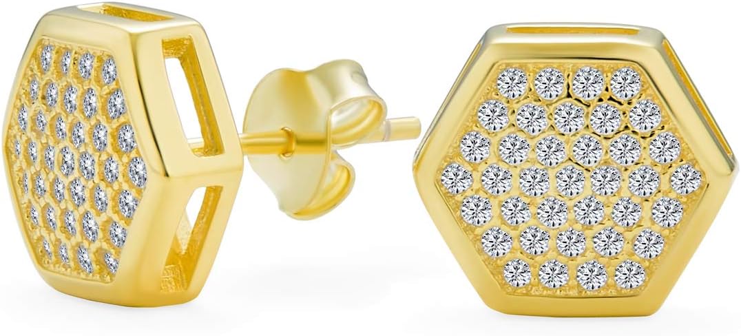 Elevate any look with these men's CZ stud earrings. Crafted from .925 sterling silver, cubic zirconia, and gold-plated for extra shine. The pave design ensures they stand out. Perfect gift for anyone. Secure friction back prevents loss. Exclusively for pierced ears.