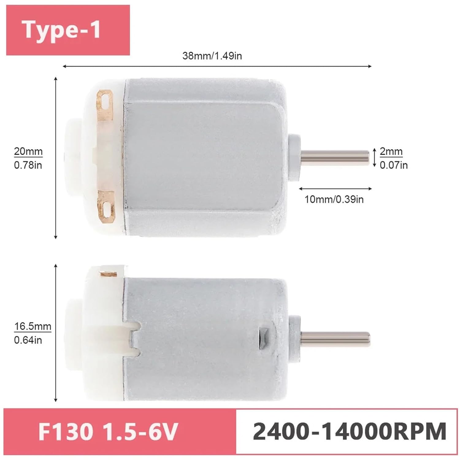 MotorsDescription Commutation: BrushModel Number: F130 R140 R260 RS365 RS385 R280 RS380No load Speed: 5000-24000RPMVoltage: 1.5A-24VOutput Power: 0-10WType: MotorProduct Weight: 28 G / 0.99 OuncesProduct Dimensions (L*W*H): 51*26*26 MM / 2.01*1.02*1.02 InchesPackage Weight: 40.0 G / 1.41 OuncesPackage Dimensions (L*W*H): 51*26*26 MM / 2.01*1.02*1.02 InchesRetail Packaging: No, No PackingPackage include Package Including: 1 x DC Motor