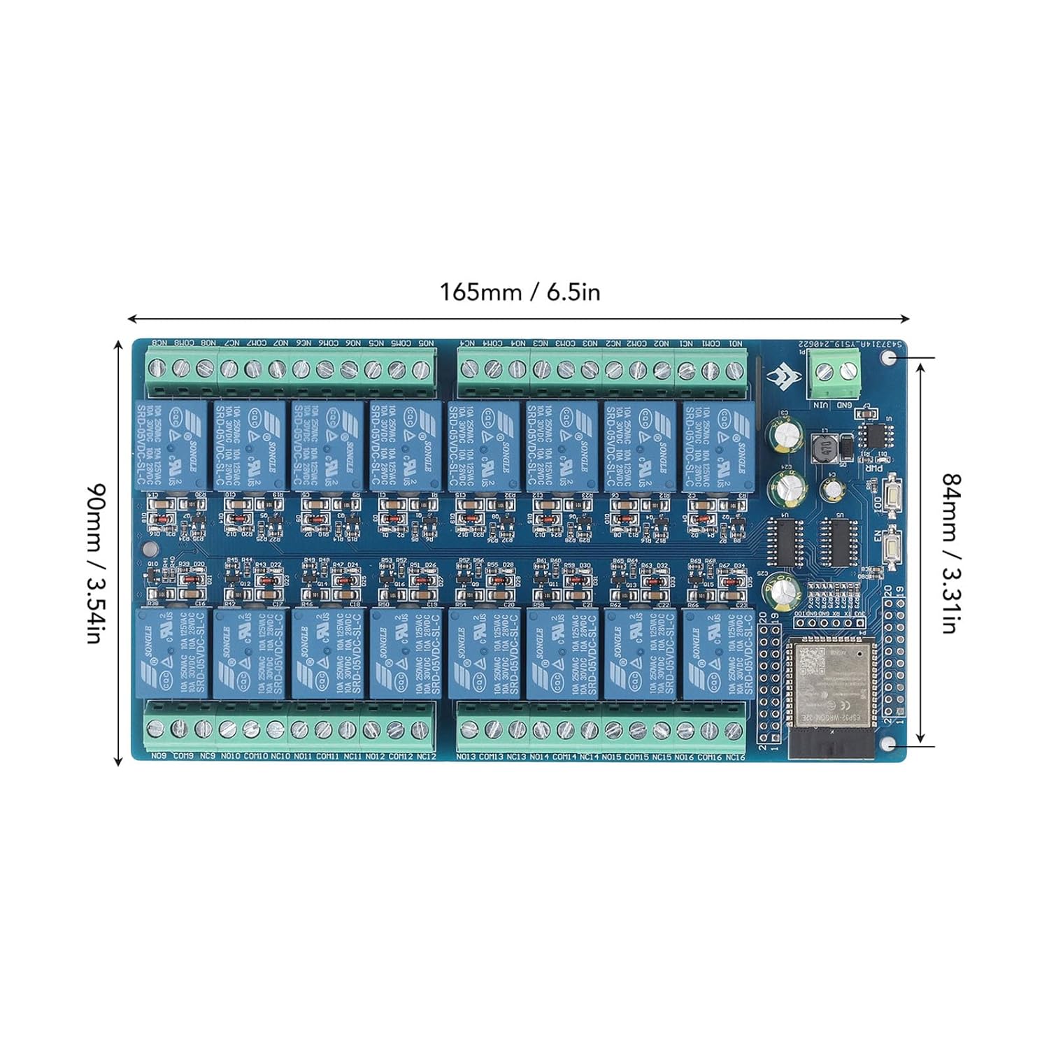 [Versatile Power Supply] Equipped with a dc 5v to 3.3v power circuit, this 16 channel relay module supports a wide range of dc 5-12v power inputs, ensuring compatibility with various power sources. [Efficient Control] With 16 channels of 5v relays that output switch signals, this relay board is suitable for controlling loads with operating voltages up to ac 250v or dc 30v, offering a solution for automation and remote operating applications. [Built-in wroom-32e Module] The relay module board features a mature and stable wroom-32e module with a large 4m byte flash memory, enabling easy customization and secondary development. [User-friendly Environment] The module on the relay board is compatible with the ide compilation tool, providing a familiar and friendly development environment for users to streamline their projects. [Convenient ] The smart home relay module includes an onboard reset button and a programmable button for ease of use, offering convenient options for device reset, programming, and user interaction. Spec: Item Type: 16 Channel Relay Module Material: PCB Power Supply: DC5-12V Overall Description: DC powered for 16 channel relay module equipped with for WROOM-32E and BLE module, all I/O ports are fully expanded, supports DC5-12V power supply. Suitable for secondary development learning, control in smart home applications. Package List: 1 x 16 Channel Relay Module 2 x 10 Pin Double 1 x 6 Pin Single Row 1 x Accessories How To Use: Follow the selling point picture to learn how to use.