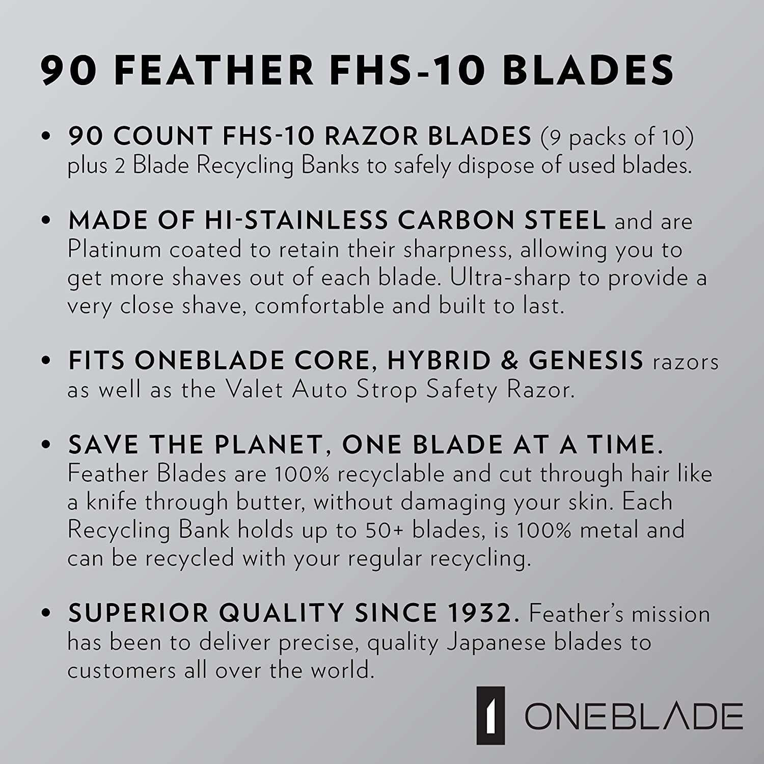 The Feather FHS-10 Hi-Stainless platinum-coated single edge razor blades are exceptionally sharp, yet ultra-comfortable. Made in Japan, these blades are thicker than most single and double-edged blades and pair with the OneBlade Razor as well as the Valet Auto Strop Safety Razor. Most users will get 2 to 3 shaves per blade, so if you shave 4 to 5x per week, this 30-pack should last you about 3 months. Comes with a blade disposal bank.