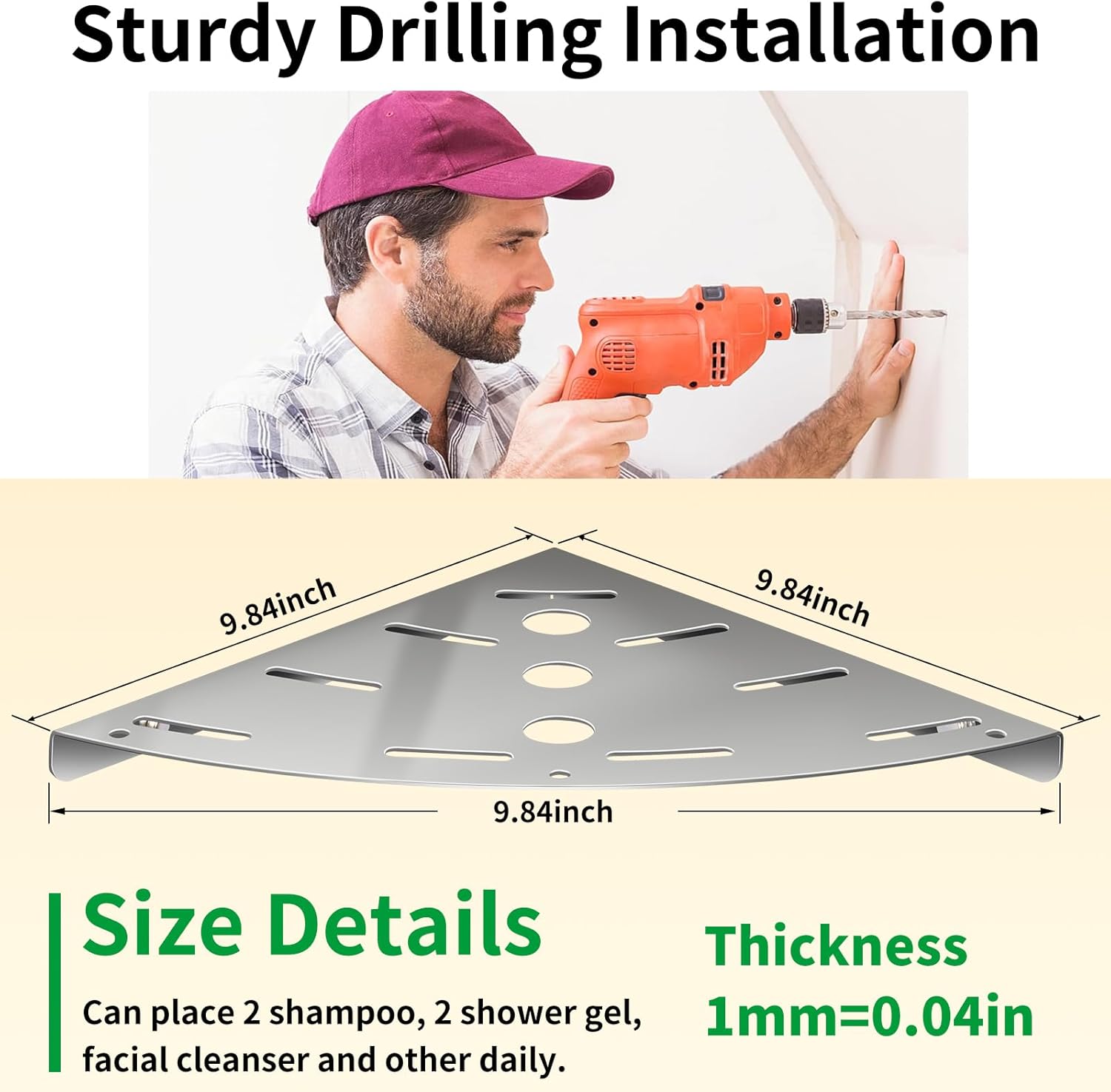| Additional Features | 304 Stainless Steel Construction, Bottle Storage, Corner Mount Design, Rust Proof, Wall Mounted |