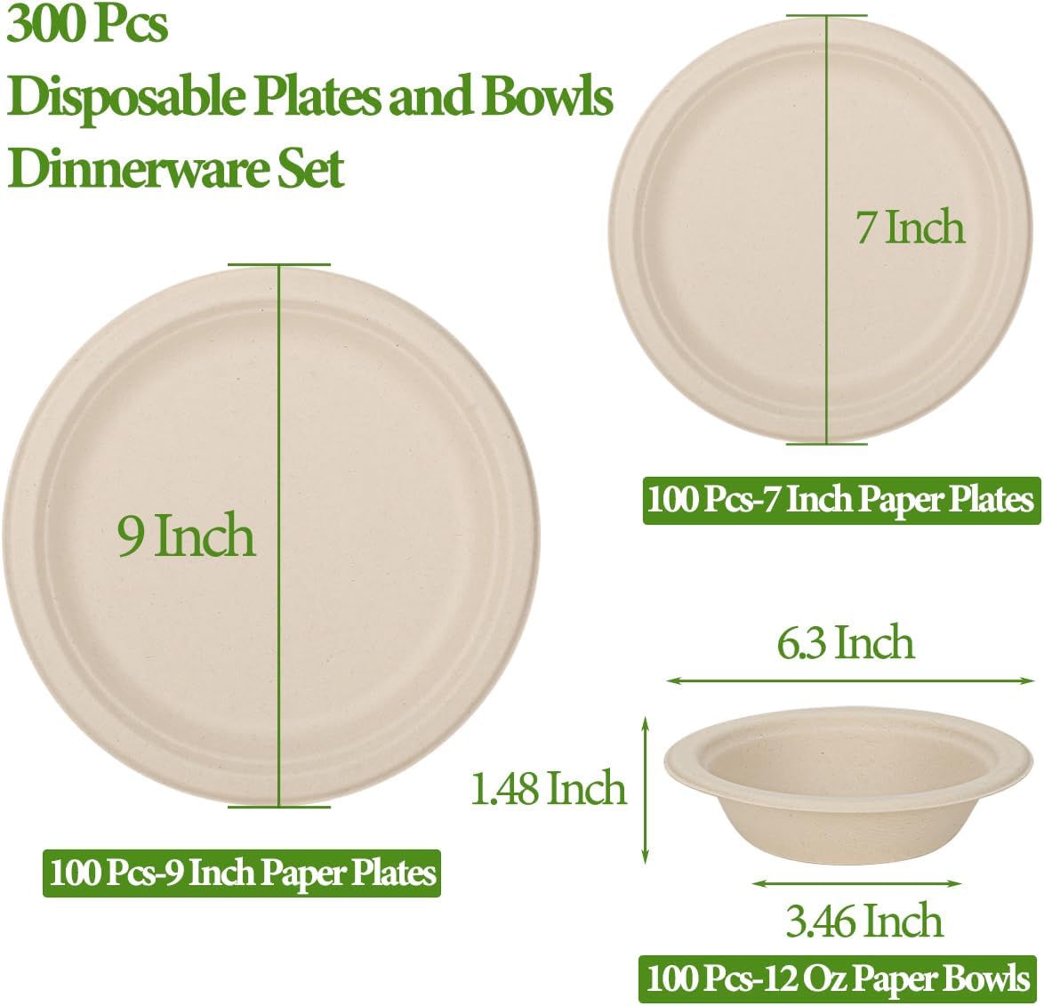 Made from natural, renewable sugarcane fiber. Durable and sturdy, suitable for both hot and cold foods. Microwave-safe for added convenience. Available in a variety of sizes to suit any occasion. Specifications Packing List: 100 x 12 Oz Paper Bowls + 100 x 7 Inch Paper Plates+ 100 x 9 Inch Paper Plates Material: Sugarcane Fiber Color: Beige