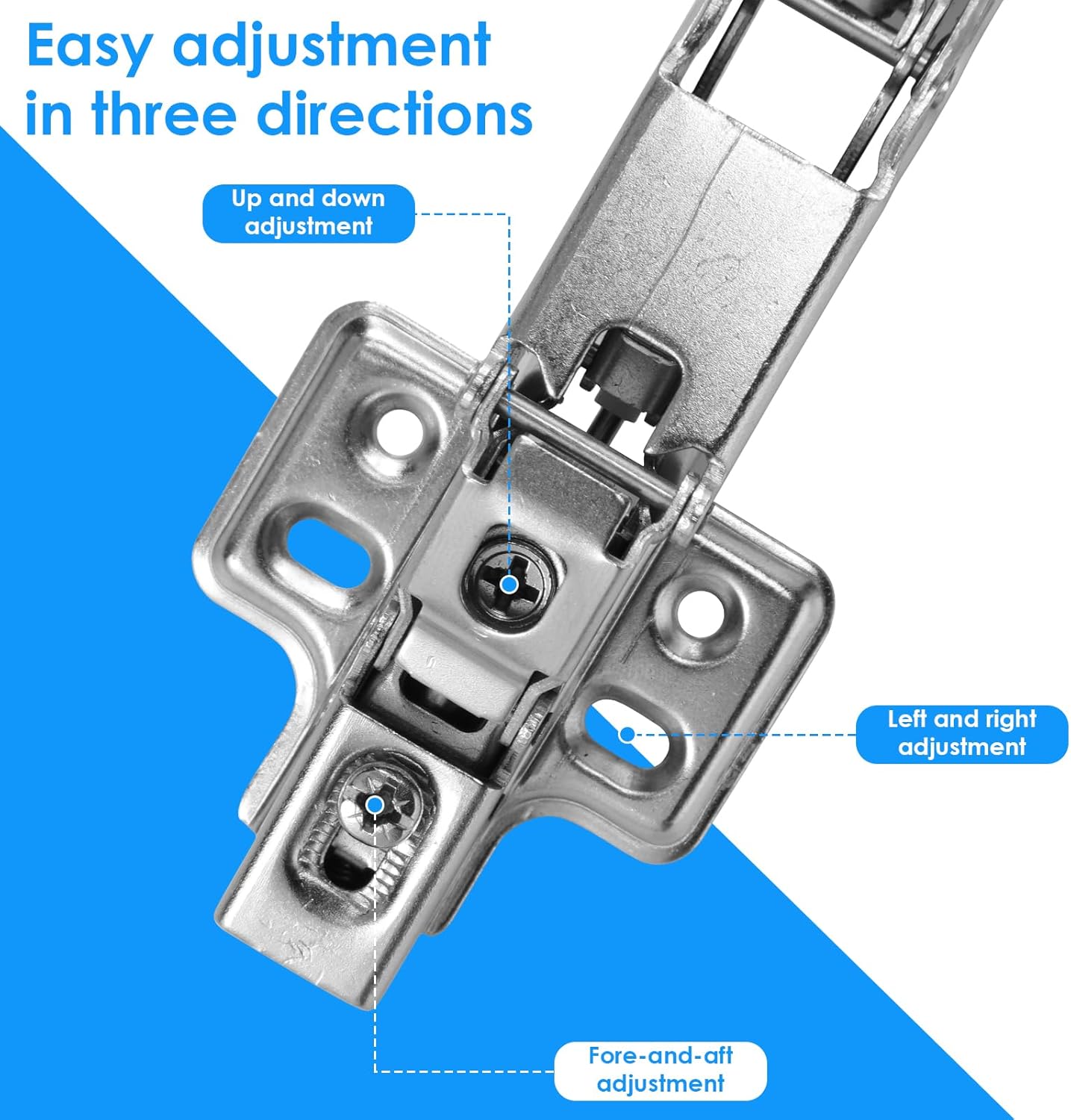 • Easy Installation & 3D/6-Way Adjustment - Equipped with a brand-new clip-on plate and 6-way/3D adjustment options, making installation quick and hassle-free. The hinges are easy to align and adjust, ensuring smooth closing of cabinet doors without complicated operations (installation guide is available for your reference).