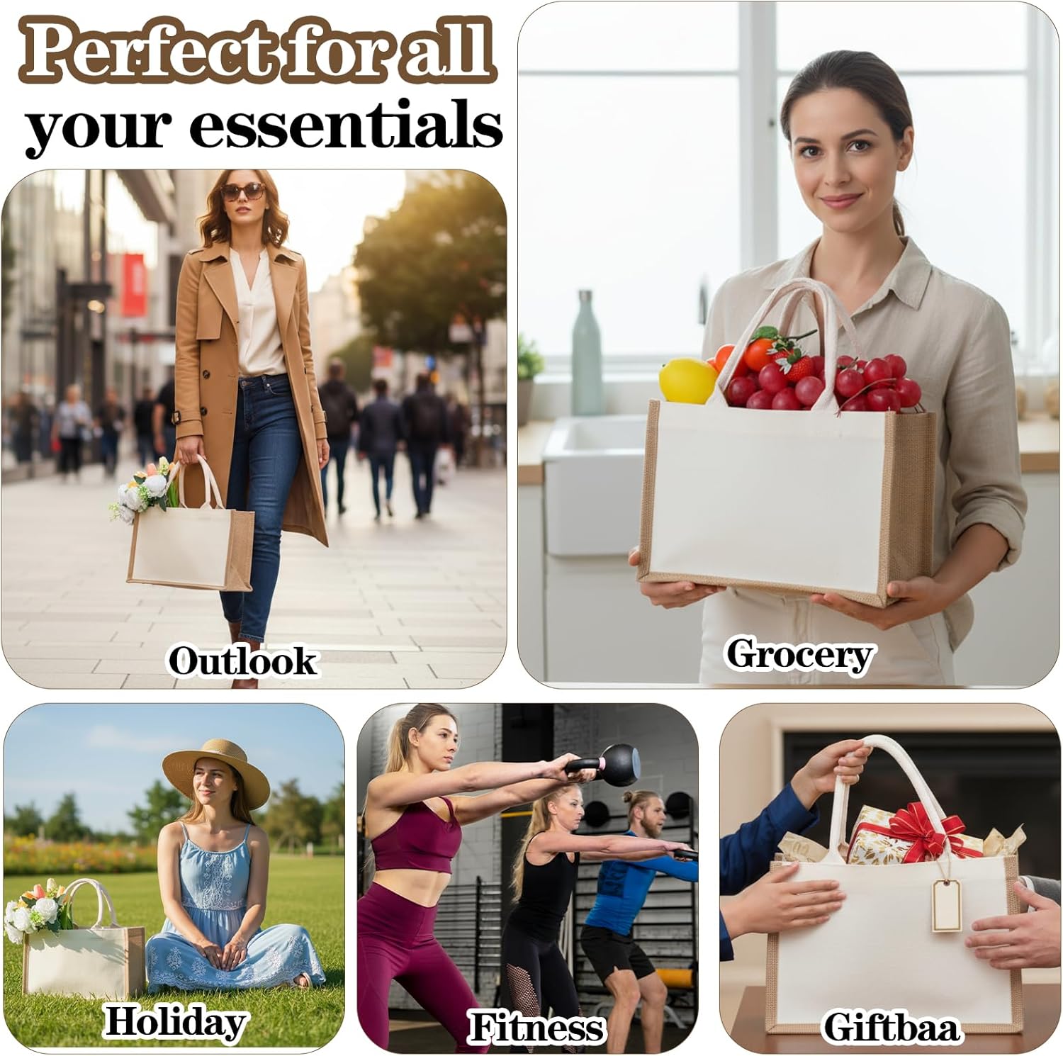 Get organized in style with our 4-set burlap tote bags with handles. These durable and charming burlap bags feature a classic rustic design. Each burlap tote bag includes a matching inner pouch. The sturdy jute bags with handles are perfect for daily use. This versatile jute bag is both practical and stylish. Our popular jute tote bag set offers great value. Ideal as blank burlap gift bags with handles for any event. Enjoy the quality of these jute tote bags with handles.SpecificationMaterial: jute and cotton canvasColor: whiteSize: burlap tote bags with handles (12.6" x 8.5" x 5.3"/32 cm x 21 cm x 13.5 cm)canvas inner pouch (7.8" x 5.9"/20 cm x 15 cm)Package includes:4 pcs burlap tote bags with handles4 pcs canvas makeup pouchesNOTES:Due to manual measurement, there may be slight errors in size.The color may exist a slight difference due to different screen displays.If you have any questions about our products, please contact us. We will be happy to serve you.