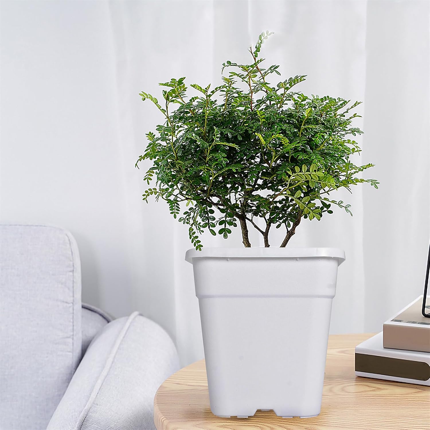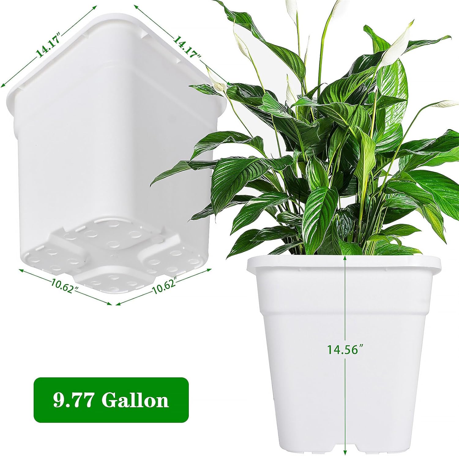 Nursery PotSpecificationColor: WhiteShape: SquareCapacity: 10 GallonSize: 14 x 14 x 13 inFeature- Our plant containers feature a sleek design that looks great in any setting, while the black color helps keep soil cool and makes cleaning a breeze- The wide rim with grip lip makes it easy to move these pots around your garden or greenhouse, while the squat round shape provides stabilityPackage Included5 x Nursery pots