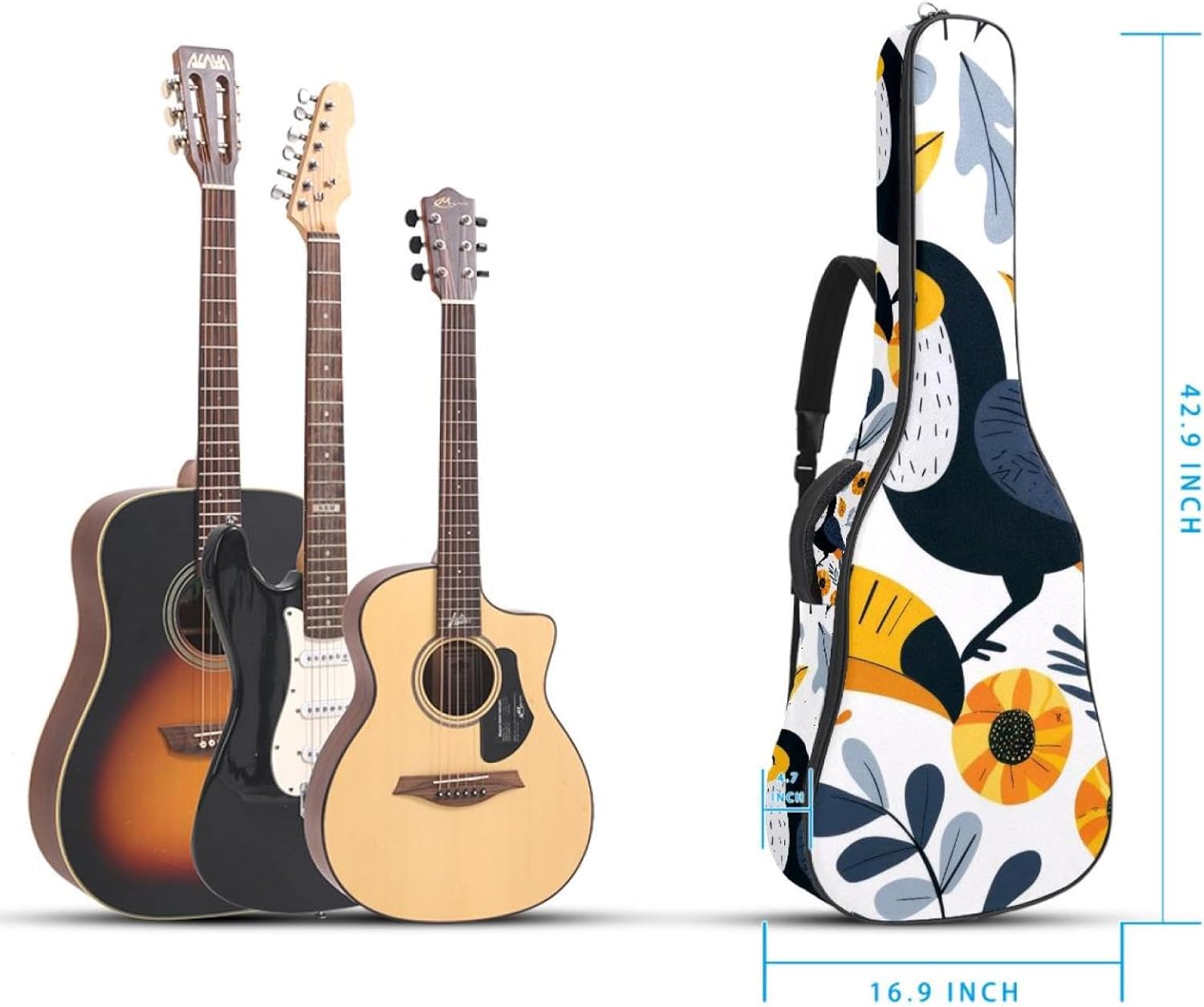 Specifications:Material: waterproof Oxford and waterproof zipper;Size: 42.9’’ x 16.9’’ x 4.7’’, perfect for 40'' 41'' 42'' guitar;Weight:36oz/1020g, lightweight;Color: Multi-color.Features:1. Adjustable backpack shoulder straps and padded side carry handle for more pleasant carrying choices.2. 10mm thick sponge padding inside provide protection for your musical instrument; and fixed Velcro above neck and body keep your acoustic guitar bag safer.3. This guitar bag comes with back hanger loop can be hung on the wall. Save more space when not in use.4. Two pockets for storage convenience, 1 large capacity pocket on outside back and 1 small pocket on the inside neck.5. Cute printed guitar gig bag guitar case backpack, ideal as a gift for your relatives or friends who love music when birthday, Thanksgiving, Christmas, holidays, and other special events.
