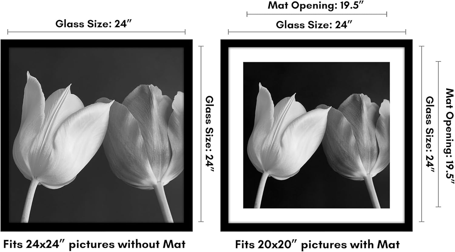 Give your memories the frame they deserve with our Americanflat 24x24 picture frame. Crafted from durable engineered wood (MDF) with a sleek, wide molding, this is more than a picture frame; it’s a game changer for your decor. The polished plexiglass front offers crystal-clear view while protecting your photos, posters, or artwork from dust and scratches. Because your favorite moments deserve nothing less than perfection. Versatility meets style with these black frames. Hang it vertically or horizontally using the included hanging hardware, and make it the perfect fit for any wall. It's and ideal way to showcase your cherished photos anywhere in your home or office. Display your 24x24 photos without the mat, or use the included mat for a 20x20 display. No matter how you style it, the black finish adds a timeless touch, instantly elevating your space. Refreshing your display has never been easier. The easy-to-open turn buttons make swapping photos a breeze, so you can update your walls as often as you like. Plus, the sturdy backboard keeps everything securely in place, ensuring your memories always look their best. Why settle for boring walls when you can have a gallery at home? This square frame is built to last, combining style and functionality to create keepsakes you’ll treasure forever. Order yours today and join thousands of satisfied customers who’ve transformed their spaces with Americanflat.