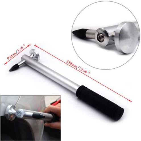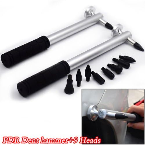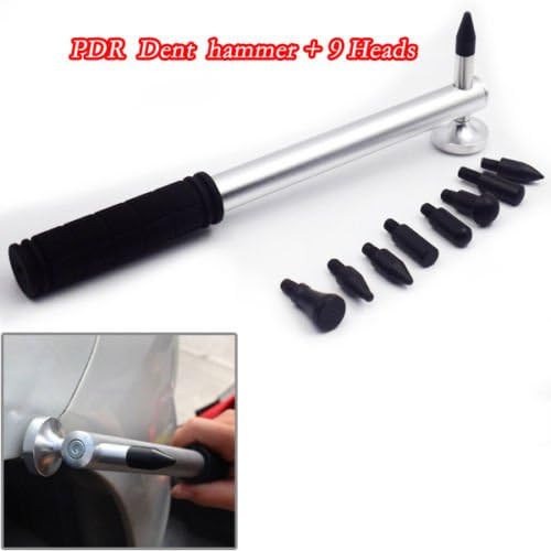 Features and Benefits: The Hail Hammer is a Dent Hammer with an interchangeable tip for some DENT which is irregular. Suitable for the dent of all kinds of flat metal , Auto metal Doors and refrigerator. By the Hail hammer can quickly repair auto-body dents. By the Hail hammer does not damage the original paint. By the Hail hammer has the advantages of simple operation. How to use paintless dent repair kits ? Clean the dent with a clean wet cloth; Mount the glue stick into the glue gun,pull the trigger to let the glue stick enter into the glue gun, connect the power source and preheat for 5 minutes; Use a proper drawing gasket. Large dent requires a large drawing gasket. (Note: The larger the drawing gasket is, the larger the drawing force is); Pull the trigger and apply the drawing gasket with extruded glue (The 4 holes of gasket should be applied with hot melt glue); Fast place the drawing gasket with hot melt glue at the center of dent, press lightly until the glue cures and adheres (Let the glue coolfor about 8 minutes. The cooling time should be less than 10 minutes and should be shorter slightly in winter); Align the T-shaped repairer and press the drawing gasket with hot melt glue, pull the sliding rod backwards to pull up the dent; Check with a Line board. If dent still exists, knock it slightly with a flattening hammer or pen; Clean the repaired place with a clean wet cloth. Package included: 1X Dent Hammer 9X Heads