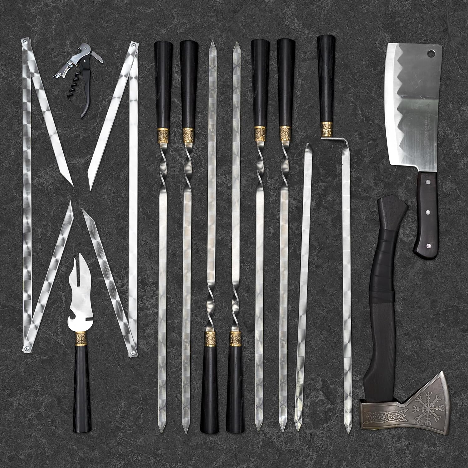 39 Pcs. Grilling Accessories BBQ Supplies. Grill Utensils Set. Barbeque Accessories for Outdoor Grill. BBQ Tools Set Grilling. Skewers for kebab. Premium Grilling Gift for men. Outdoor BBQ kitchen. BBQ Set "Zebra" A set of skewers is a must-have for anyone who likes to cook over a campfire. The set consists of 39 items. Everything you need for cooking different dishes on a bonfire. The exclusivity of the Chameleon set is in the design of a wooden box, which can easily be transformed into a table for a comfortable rest in nature. Such a set will be an excellent gift for your family, relatives, friends, or work colleagues. All Tools are made out of high-quality food-grade stainless steel so you can be sure that this Grill set will last a lifetime.This set can be a great BBQ gift for man. Contents of the set: 1. 6 skewers (stainless steel) 2. Double prong skewer 1pc (stainless steel) 3. Axe 1pc (carbon steel) 4. Folding legs for grill 1pc (stainless steel) 5. Pliers 1pc (stainless steel) 6. Stacks 4pcs (food grade stainless steel) 7. Hatchet 1pc (food grade stainless steel) 8. Barbecue fork 1pc (stainless steel) 9. Corkscrew-opener 1pc (stainless steel) 10. Grill grate 1pc (stainless steel) 11. 4 deep plates (stainless steel) 12. 4 table spoons (food-grade stainless steel) 13. Table forks 4 pieces (food grade stainless steel) 14. Table knives 4 pcs (food grade stainless steel) 15. Trays 4 pcs (food grade stainless steel) The weight of the box is 10 kg