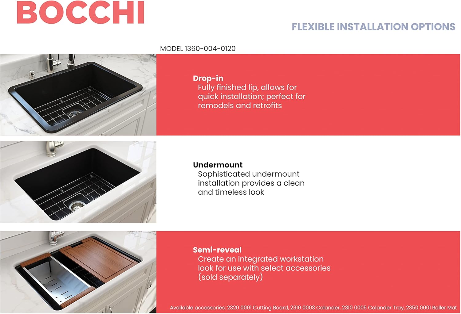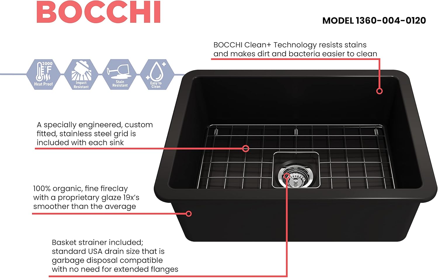 Product Description BOCCHI sinks bring back the ultimate material to your kitchen. FIRECLAY, a 100% NATURAL ORGANIC and recyclable material used by Craftsman for centuries to create timeless appliances has now returned to your kitchen. With the firing in our Kilns up to 2000°f temperatures, FIRECLAY becomes the most DURABLE MATERIAL used in today's kitchens. Dealing with extreme heat coming from pots and pans - no problem. Due to their special glaze coating fused with the FIRECLAY body, these sinks have a non-porous, uniform, SCRATCH AND STAIN RESISTENT surface. With its INCLUDED protective bottom GRID and distinctive looks, BOCCHI sinks are truly crafted to match your design and functional desires and beyond. From the Manufacturer BOCCHI sinks bring back the ultimate material to your kitchen. Fireclay, a 100% natural organic and recyclable material used by Craftsman for centuries to create timeless appliances has now returned to your kitchen. With the firing in our Kilns up to 2000°f temperatures, fireclay becomes the most durable material used in today's kitchens. Dealing with extreme heat coming from pots and pans - no problem. Due to their special glaze coating fused with the fireclay body, these sinks have a non-porous, uniform, scratch and stain resistant surface. With its protective bottom grid and distinctive looks, BOCCHI sinks are truly crafted to match your design and functional desires and beyond. P.when('A').execute(function(A) { A.on('a:expander:toggle_description:toggle:collapse', function(data) { window.scroll(0, data.expander.$expander[0].offsetTop-100); }); }); Set Contains: single-bowl-sinks See more