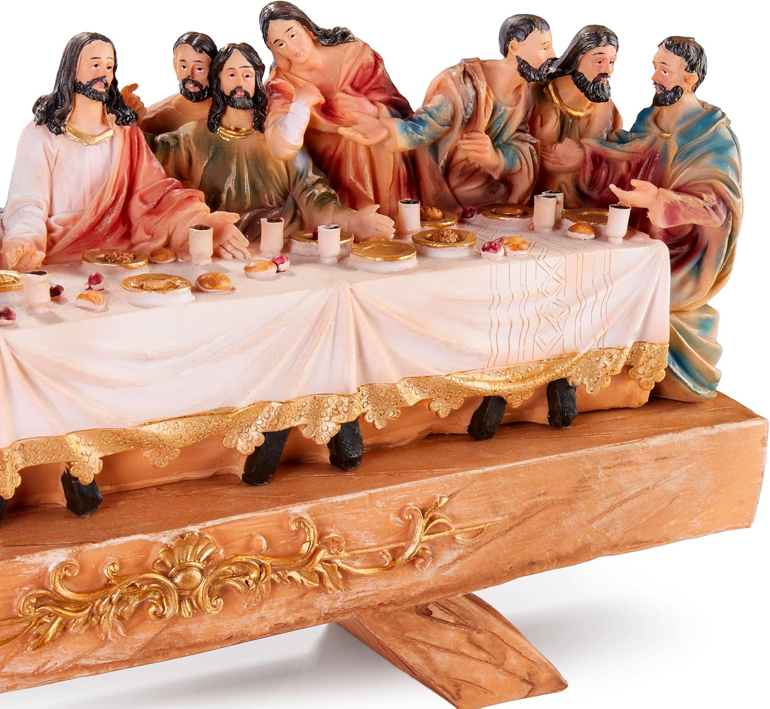 Elevate Your Holiday Decor with "The Last Supper" Nativity Scene Christmas Decoration Introducing our exquisite "The Last Supper" Nativity Scene Christmas Decoration, a stunning tabletop centerpiece that captures the essence of the holiday season with unmatched artistry. This premium figurine, designed in Germany, is a testament to the beauty of the Nativity Scene, providing a captivating portrayal of Jesus and His 12 disciples sharing the last supper. Crafted with intricate attention to detail, it's more than just a holiday decoration; it's a true work of art that will enhance your home's ambiance during Christmas and beyond. Exquisite Craftsmanship in Polyresin This exceptional Nativity Scene Set is meticulously crafted from high-quality polyresin, ensuring durability and exquisite detailing that rivals traditional sculptures. Measuring 15.35 x 8.25 x 4.35 inches (width x height x depth), it's the perfect size for any tabletop or mantel. The Nativity Scene figurine itself stands on a wooden-look table adorned with golden accents, creating an opulent aesthetic that's sure to captivate your guests and family. A Meaningful Christmas Gift "The Last Supper" Nativity Scene Figurine makes for an exceptional gift for your loved ones. Its profound representation of a cherished biblical moment brings depth and reverence to the holiday season. Whether you place it in your living room, dining area, or even in your office, this decorative sculpture adds a touch of spiritual significance to your indoor decor. Properties: - Premium Nativity Scene Christmas Decoration - Designed in Germany for superior quality - Crafted from durable and detailed polyresin - Dimensions: 15.35 x 8.25 x 4.35 inches (width x height x depth) - Depicts Jesus and His 12 disciples at the last supper - Wooden-look table with golden accents - A thoughtful and meaningful holiday gift
