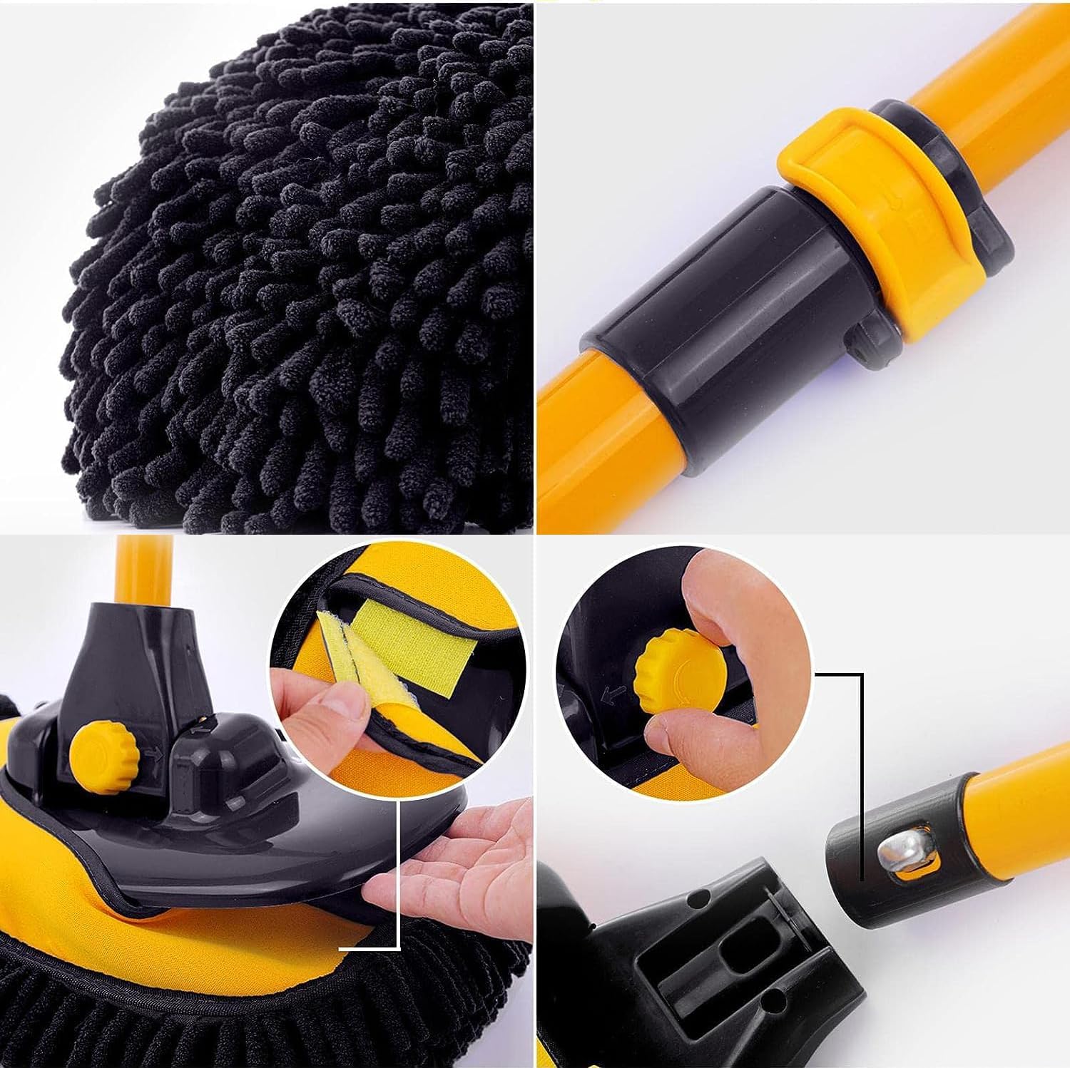 Sturdy Materials The car wash brush is equipped with aluminum poles and the washable pads are made of microfiber material, which is super absorbent and can be used for a long time. The washable pad has fluffy velvet and is soft and does not hurt the car. The mop is upgraded and not easy to shed fluff. 【90 Rotatable Head】This chenille microfiber car wash mop has a 90 rotating head that fits the car body perfectly. Effectively prevent dust accumulation in hard-to-clean corners. Free rotation in multiple angles, making car washing more convenient. Wide application: you can use this long handle car wash brush to clean the interior and exterior of your car windshield, suitable for many cars, trucks, SUVs, RVs, etc. MULTIPURPOSE CLEANING PRODUCT: The car wash brush is the perfect helper for washing, drying, waxing, dusting and polishing your vehicle or home. Also suitable for cleaning air conditioners and floors. Make cleaning easier, faster and more convenient. Car wash kit includes: 1 x aluminum alloy long handle mop, 2 x chenille microfiber cleaning heads, 1 x microfiber car cleaning cloth and 24 hours online customer service.