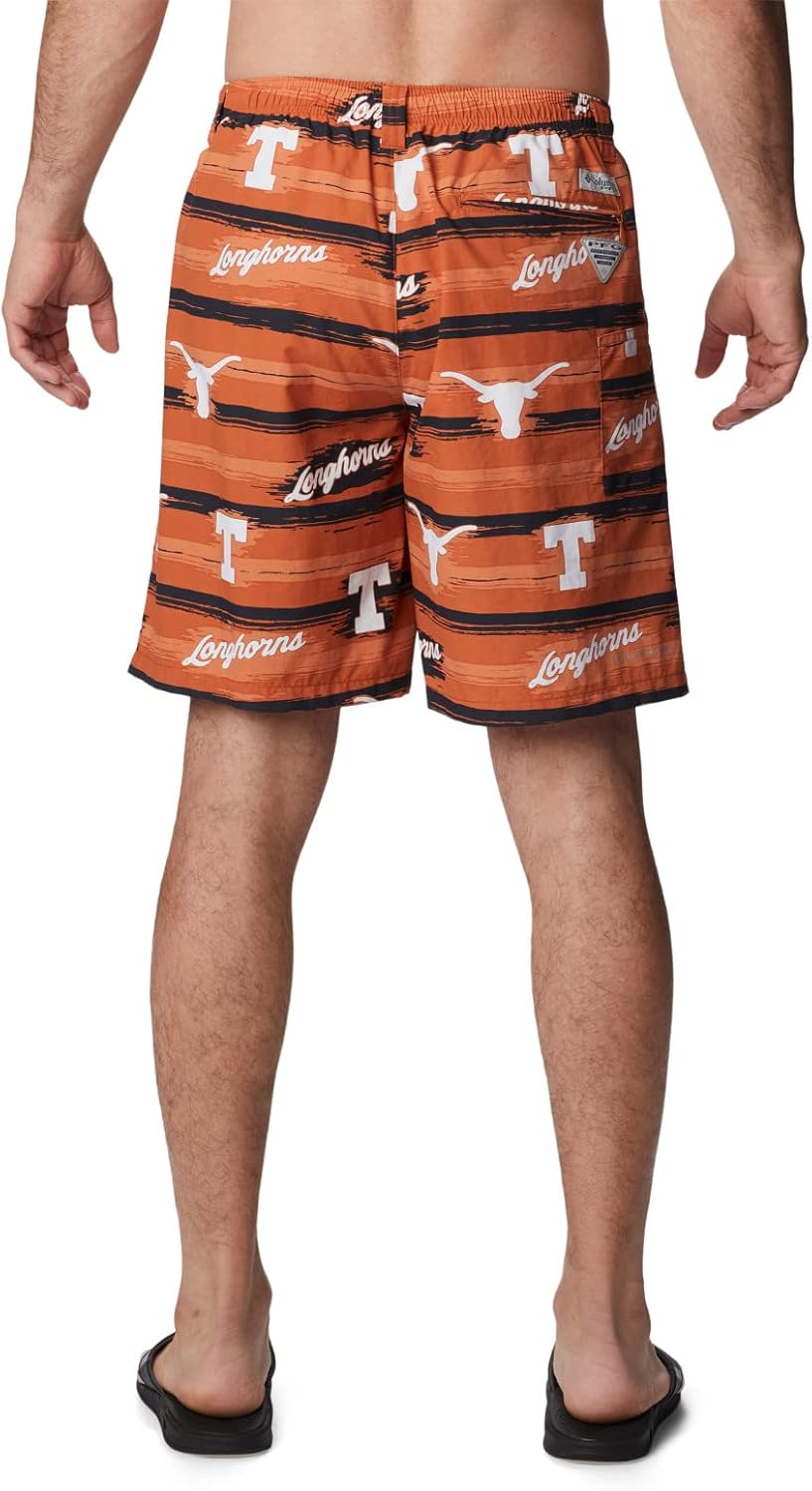 College inspired, adorned with your favorite college logo, these shorts were made for water activities. The Columbia PFG Men’s Backcast II Printed Shorts are easy-fitting with built-in UPF 50, nylon construction, and a built-in mesh brief, perfect for days on the lake, a float on the river, or charging the surf. Advanced technology and functional design make for a great experience. Whether you're out for hours of fishing, swimming or just poolside, these amazing shorts will not disappoint. The interior mesh brief offer wet or dry use while the protective exterior features our Omni-SHADE UPF 50 to help block and shield from UVA and UVB sun rays. Durable, comfortable, and versatile, they include two hand pockets, a cargo pocket, and a zippered security back pocket. Wear with the drawcord adjustable waist, or use the built-in belt loops when stepping up the level of casual attire. Columbia offers these collegiate shorts with many college logos and in a variety of sizes. Relaxed Fit. To ensure the size you choose is just right, please refer to our sizing chart. To find your waist measurement, measure around your natural waistline