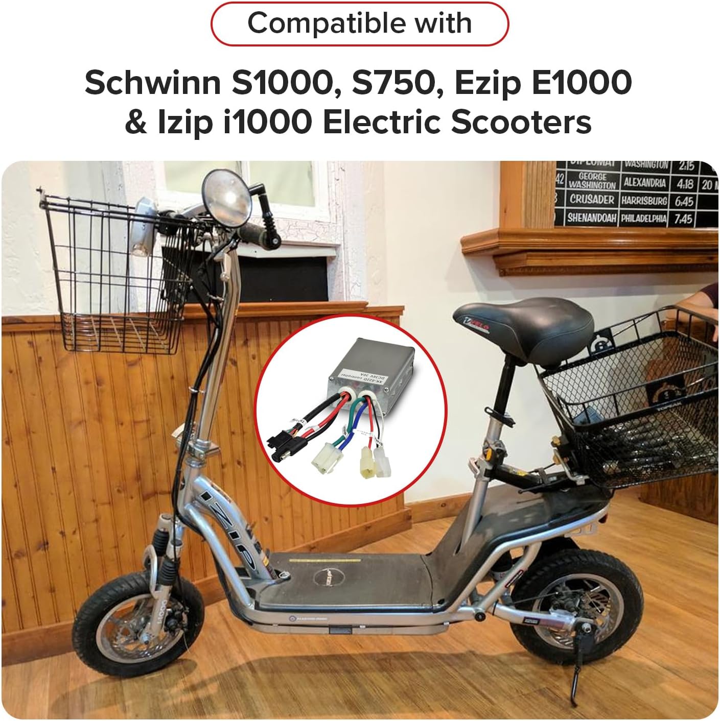 Currie High Performance 36 Volt 30 Amp Controller w 5-pin Throttle Connection. This 36 Volt 30 Amp diagnostic voltage controller is manufactured with a Smart Power Microprocessor and the controller is fully waterproof, with a brake inhibit power cut off. 5 Pin Throttle Connector: This controller comes with five connectors for easy installation. Note that the flat black connector contains five pins within the connector (connected by five wires). This controller is not compatible with 3-pin or 6-pin version throttles. You will need to buy our 36 Volt Electrical Kit which includes both the 36v 5pin throttle and 36 volt 5-pin controller, or you can simply order a matching Currie 36 volt 5 pin throttle to work with this controller. Works with Schwinn S1000, S750, S600, Izip i750, Izip i1000 & Ezip E1000 36 Volt Electric Scooters.