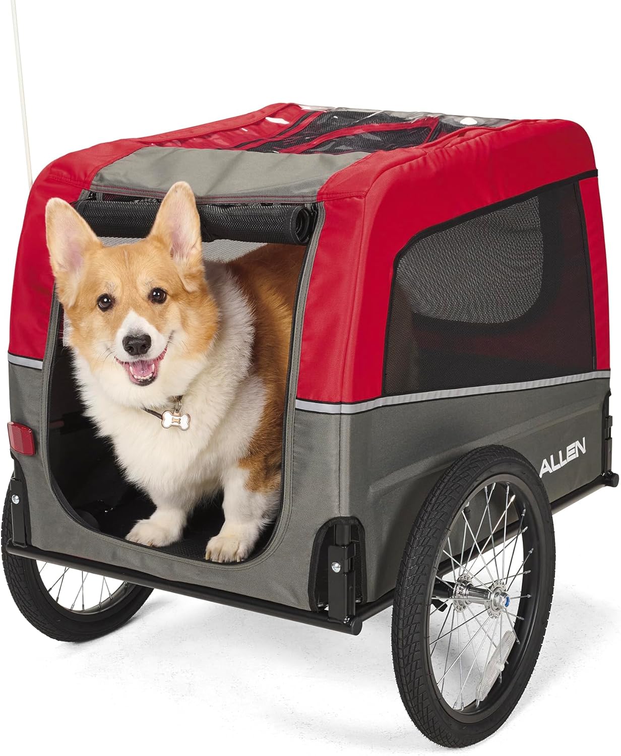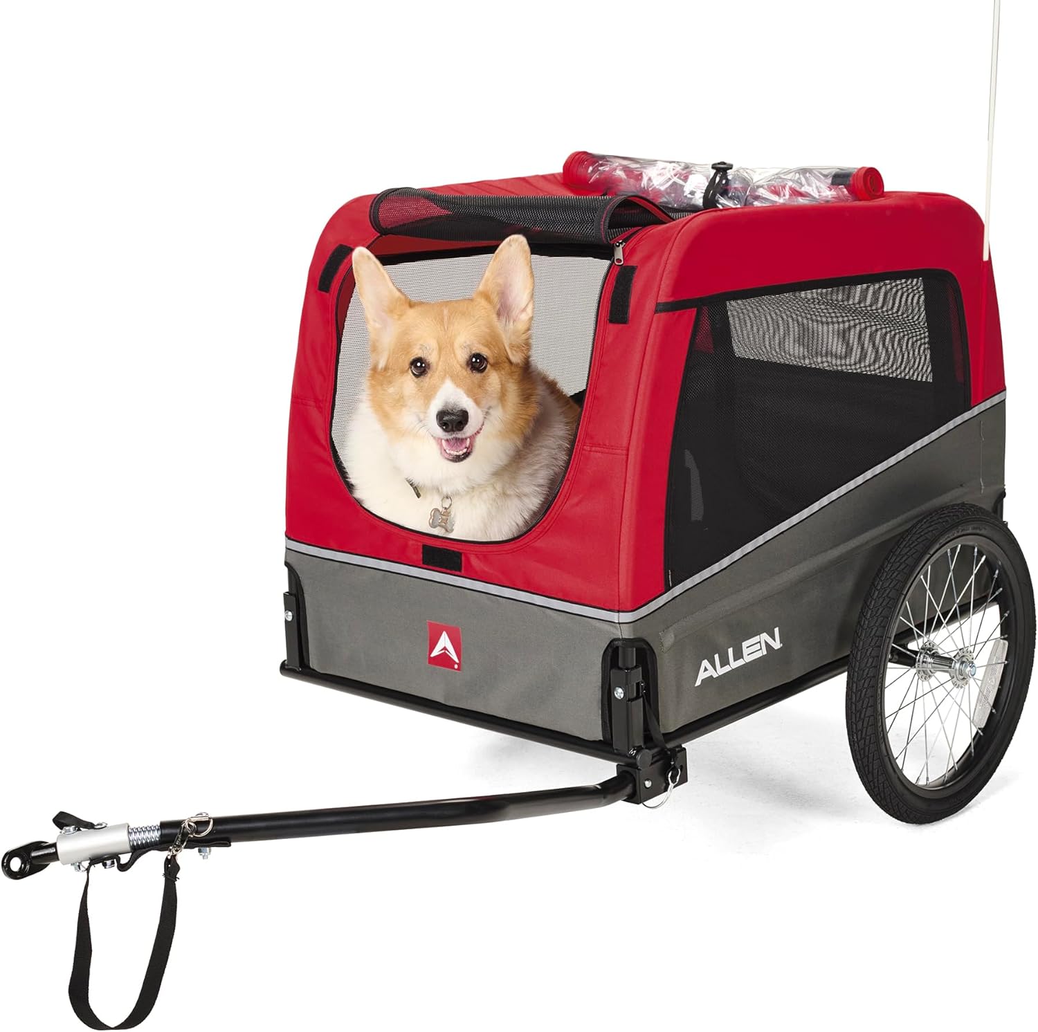 The Allen Deluxe Dog trailer offers the perfect outdoor solution for active parents. Fits one medium sized dog or multiple small dogs, up to 66 LB Easy clean non-slip rubber bottom, plus interior leash for added security Easy entry rear door Pet friendly Rear pocket for dog gear Zipped sunroof on the top Universal trailer coupler fits most bikes E-Bike friendly All Allen trailers pass the ASTM trailer safety standards.