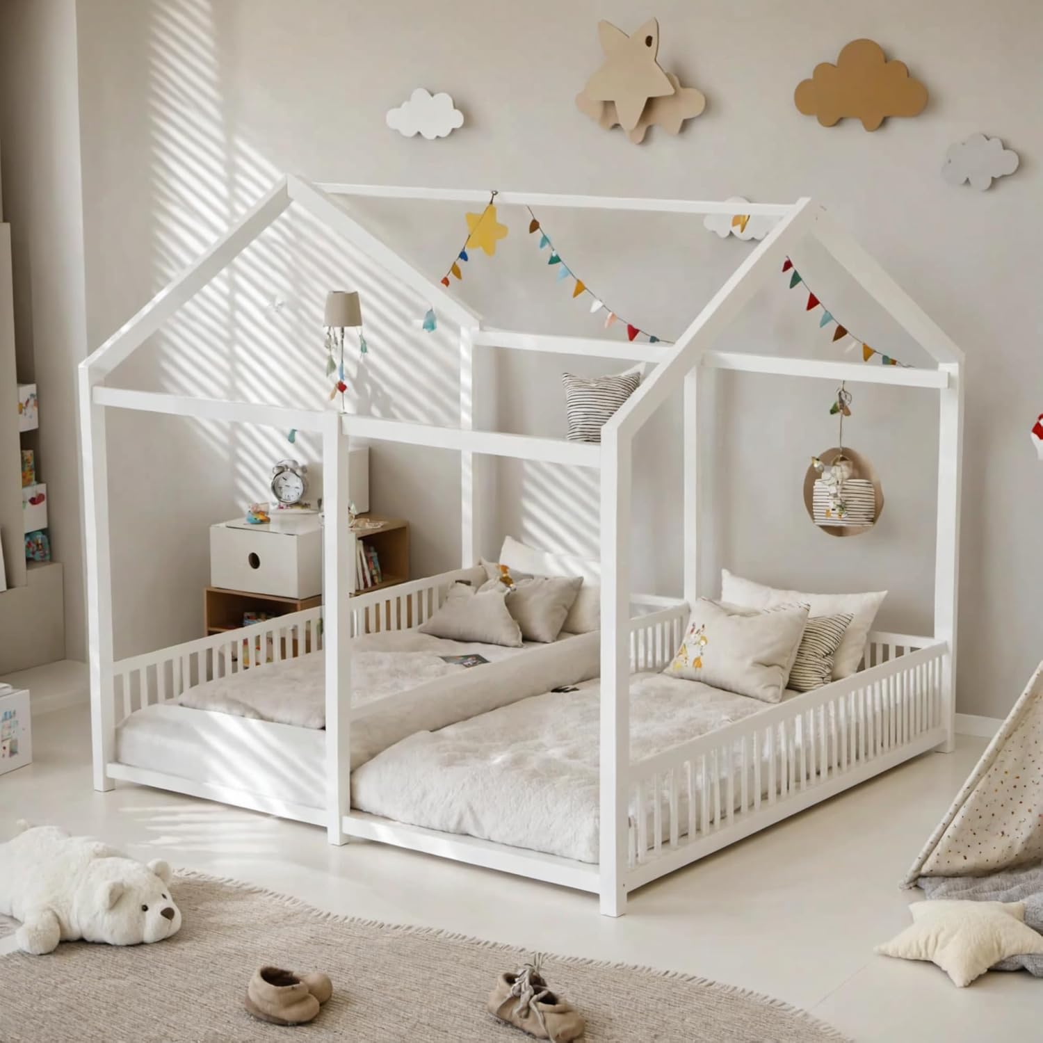 Double Twin Size House BedThis adorable house bed frame, constructed with sturdy steel for durability, is perfect for creating a fun and imaginative space for your kids. Shaped like a charming house with a roof, it provides a cozy sleeping area while also doubling as a play space. Two twin-sized platforms side-by-side accommodate siblings or friends for sleepovers. The low profile design ensures safety, eliminating worries about falls from a top bunk. Guardrails around the bed offer additional security for your little ones. Easy assembly with all parts, tools and instructions included means you can have this bed set up in under an hour, creating a dream space for your kids to play and sleep.