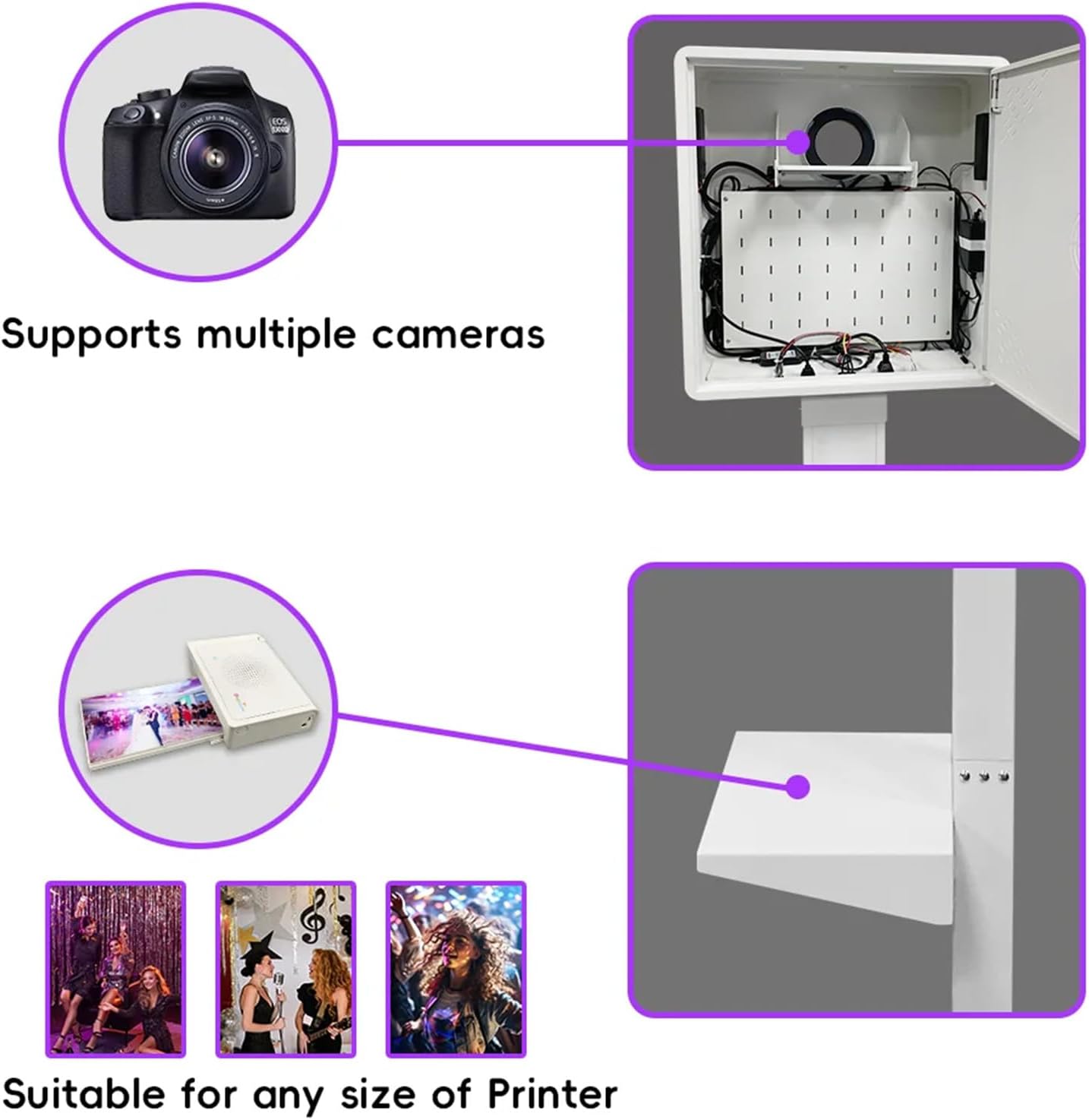 NOTE: 1. Import duties or taxes are not included in the item price, buyers are responsible for any taxes charged by your local customs. 2. Printer and camera are not included, you need to prepare them yourself. Features This DSLR Photo Booth can be configured with different languages, has a touch screen, can be connected to a camera to take photos and a printer to print photos, and has a Mini PC of i5 8GB 126GB. After-Sale One year warranty for the DSLR Photo Booth machine, please contact us if the machine has non-human quality problems or you need help, we have a professional team to help you. SETTING Built-in 15.6-inch touchscreen camera. Processor: i5 3rd generation, 8 GB RAM Win10 system flight case packaging Product size: 48*39*163cm Material: metal Package Included: 1.15.6-inch touch screen 2. Windows 10 3.intel15 8GB+128GB 4.RGB ambient light strip 5. Red carpet and props 6.Power adapter 7. Flight box