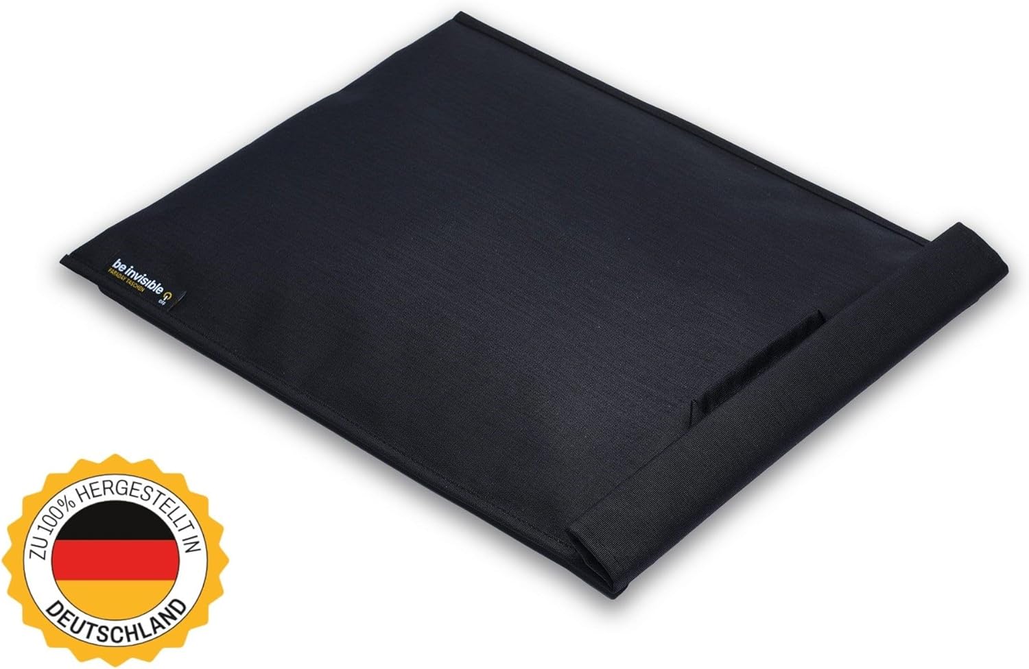 - Maximum security for your digital data – anywhere, anytime In a world of increasing cyber threats, the Be-Invisible Faraday bag offers uncompromising protection for your sensitive information. Thanks to the latest shielding technology, the case immediately and completely disconnects your device from all wireless networks - without having to turn it off. Your data remains secure, private and invisible. - High-performance, professional-grade Faraday shielding Our Faraday bags have at least triple, partially five-fold shielding and achieve a shielding attenuation of up to 125 dB. Electromagnetic signals cannot enter or escape the bag. This completely isolates your device and effectively protects against hacking, spying, tracking and remote access. This proven technology has been used by military and police for years to secure digital evidence from tampering, data loss or unauthorized access - more important than ever today. - Instant offline – without turning off the device Once your device is in the bag, all connections are reliably blocked: * Mobile radio (2G, 3G, 4G, 5G) * WiFi * Bluetooth * GPS, location & tracking * Satellite connections * RFID & NFC * Keyless-Go signals * Remote start of malicious or spy software So no motion profiles are created. no Unnoticed data access. - Effective protection against keyless-go theft & area scans The Be-Invisible Faraday case prevents radio signals from Keyless-Go car keys from being extended or read out. This reliably protects against modern vehicle theft by radio extension as well as from large-scale scans of mobile devices. - For devices, cards & ID cards with RFID The case securely blocks all connections: * Smartphones & mobile phones * Tablets & Smartwatches * Credit cards & debit cards * ID cards & RFID chips Ideal for work, travel, leisure and anyone who values data protection and privacy. - Innovative Cordura Soft Bag – robust & sustainable The outer material is made of high-quality Cordura high-performance fabric, which has been specially developed for extreme loads. It is: extremely abrasion and tear-resistant, water-repellent, durable and easy to clean, pleasant to the touch, foldable and rollable to the smallest dimensions. The material is environmentally friendly made from recycled raw materials and is fully recyclable - maximum protection with sustainable demands. - Safety note: This soft bag is closed with fastener and is not magnetic. Credit cards or other cards with magnetic strips are not at risk. - Box contents: 1 x Be-Invisible Faraday case (devices or accessories shown not included)