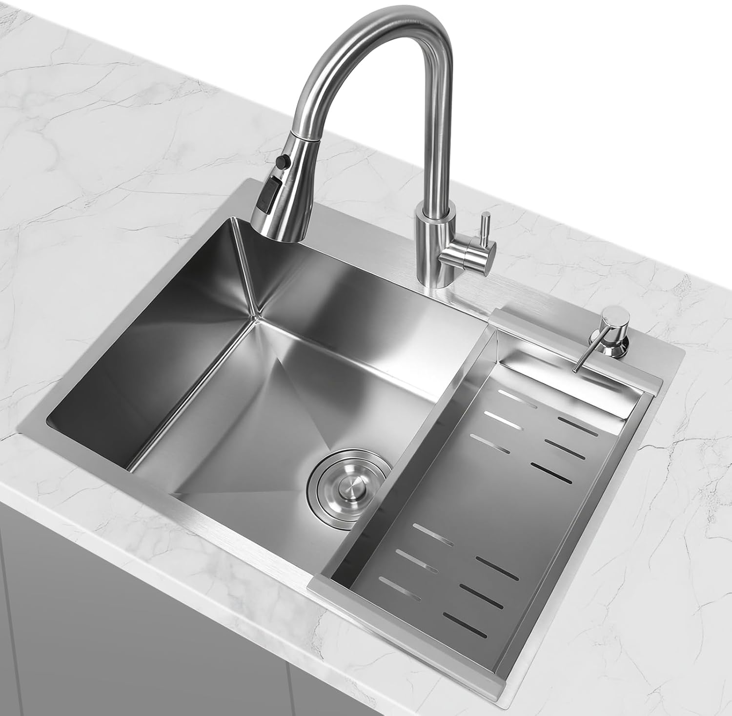 Specification: Size: 600.00 x 450.00 x 200.00 mm/ 23.62 x 17.72 x 7.87 inchesNumber of Holes: TwoOrigin (country or region): Mainland China (Origin)Material: Stainless steelFeatures: With Sink style: Single slot Note:Due to different monitor settings and lighting conditions, the actual color of the item may vary slightly from the pictures. Thanks for your understanding!Please allow a 1-2 cm difference in measurements due to manual measuring.Package includes:1 x Sink1 x Drainer1 x Drain pipe1 x Kitchen 1 x Soap dispenser2 x Hot and cold water pipes2 x Angle valves1 x Drain basin