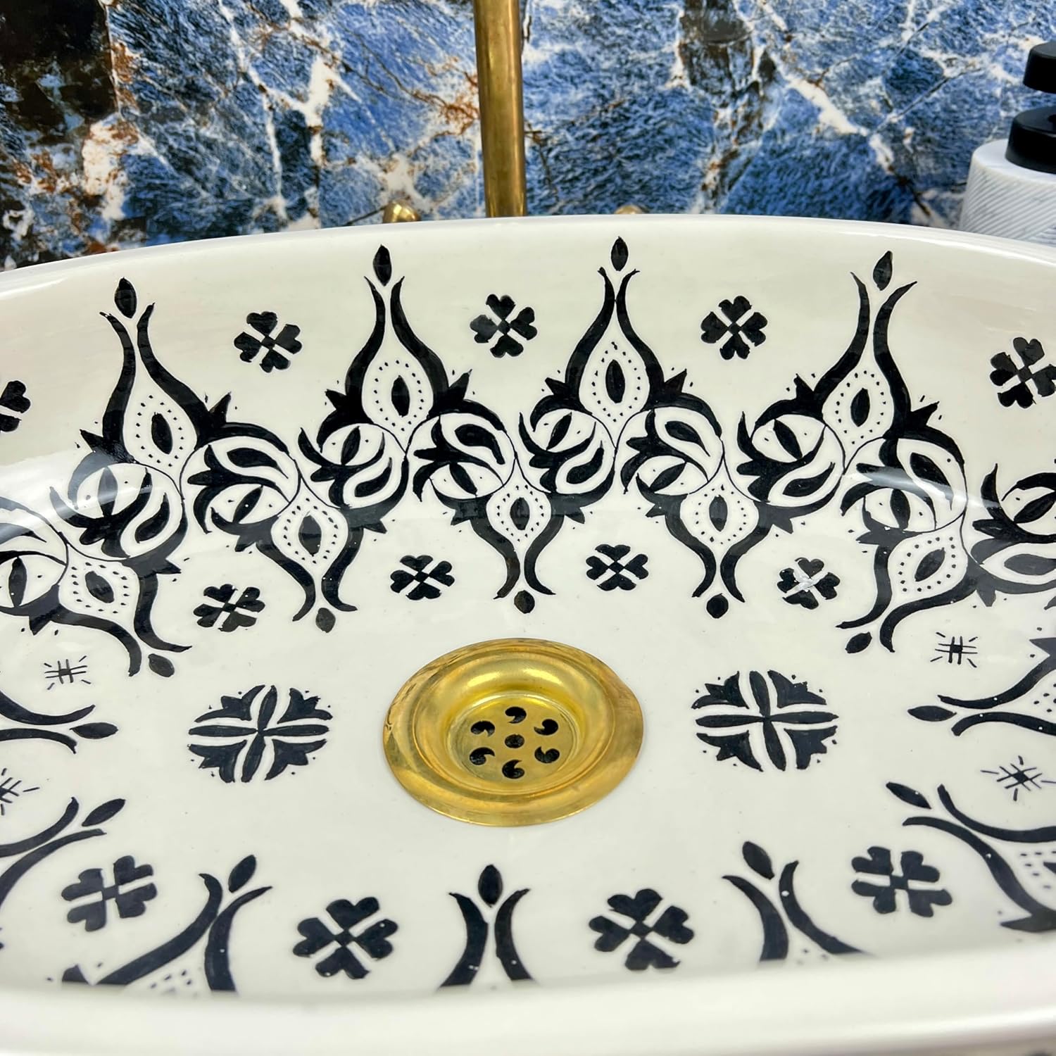 Add a touch of global elegance to your home with this Black & White Hand-Painted Ceramic Vessel Sink. Move away from boring white porcelain and embrace the artistry of this handmade washbasin. The design features a creamy white background adorned with intricate black motifs that blend traditional Moroccan influence with a modern tribal aesthetic. Design Highlights: The Look: The monochrome palette allows this sink to blend with almost any color scheme. In the photos, you can see how well it pairs with dark stone countertops and blue accent walls. The Shape: The smooth oval "boat" shape provides ample washing space while taking up less visual weight than a square heavy sink. The Feel: Because it is handmade, it brings an organic, earthy feel to your bathroom, softening the look of hard tiles and stone. Installation Advice: This is a vessel sink (sits on top of the counter). It requires a tall vessel faucet or a wall-mount faucet to clear the rim of the bowl. Note: As this product is hand-painted, the pattern placement and line work may vary slightly from the photos, adding to its unique charm.