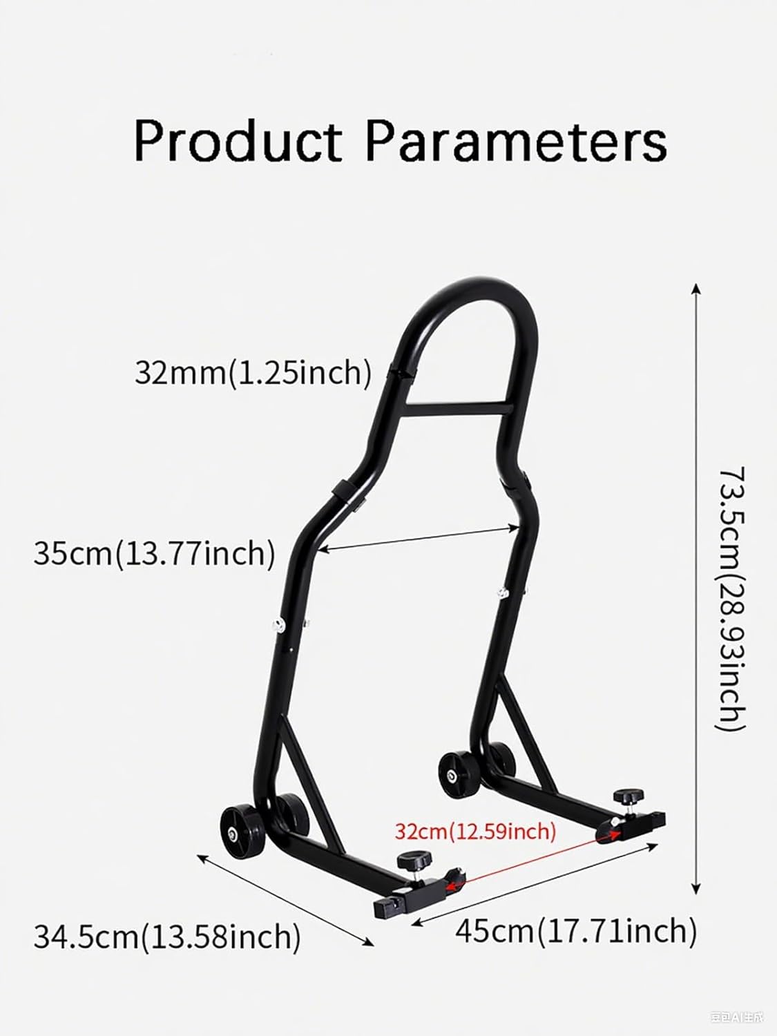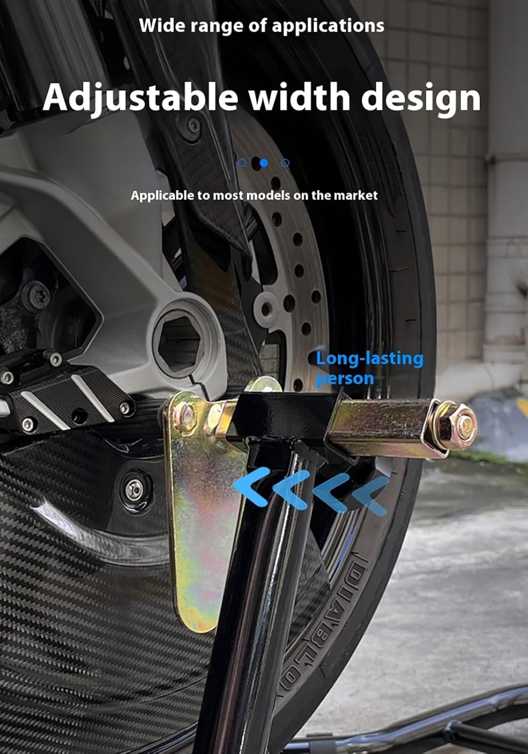Our motorcycle front & rear wheel lift stand combo provides a safe, stable, and versatile solution for motorcycle maintenance, repairs, and storage. Built with heavy-duty steel and a powder-coated finish for superior durability, this motorcycle paddock stand set can lift up to 1000 lbs (0.45 tons). Whether you’re performing chain cleaning, oil changes, wheel removal, or long-term storage, this motorcycle lift stand ensures stability, safety, and efficiency for all your garage needs.Load Capacity: Up to 1000 lbs (combined)Material: Heavy-duty steelFront Stand Adjustment Range: 8.66"–14.96" (220–380 mm)Rear Stand Adjustment Range: 7.09"–10.63" (180–270 mm)Alternative Fork Heads: U-shaped, L-shaped, and double fork heads includedWheels: 4 × high-quality PP rolling casters per standApplications: Oil changes, chain maintenance, cleaning, tire replacement, long-term storage