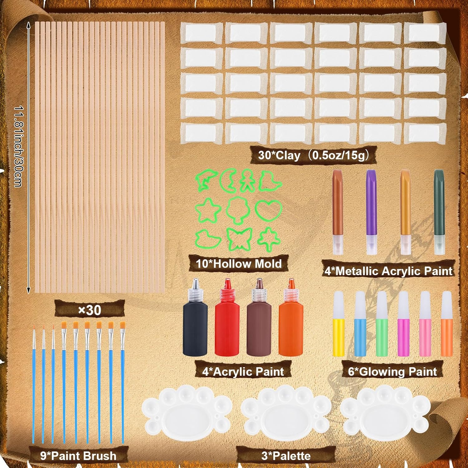 84 PCS Wizard Magic Wand Making Kit DIY Art Craft Set for Kids Make Your Own Wands for Gift, School Activities, Wizard Cosplay Masquerade, Halloween Party Favors, Student Rewards Features: Luminous Wand: Our magic wand kit set includes six specially glow paints, enabling you to release your creativity when making wands, these paints give off a bewitching luminescence in the dark, lending a distinctive and enigmatic allure to your magical wands. Preferred For Parties: Creating wizard wand kit is an excellent choice for various activities, such as parent-child bonding, birthday parties, themed events, or school activities; you can craft your favorite wand shapes with the children and paint them in your preferred colors, get ready to make the perfect wands that are uniquely yours. Color: colorful Material: wand Size: as pictures shown Package includes: 24 x wooden craft wands 24 x 0.5-ounce white light clay 6 x glow paints 4 x acrylic paints 4 x metallic acrylic paints 6 x flat-tipped brushes 3 x pointed brushes 3 x paint palettes Note: The colors may exist slight difference due to different screens. Manual measurement, please allow slight errors on size.