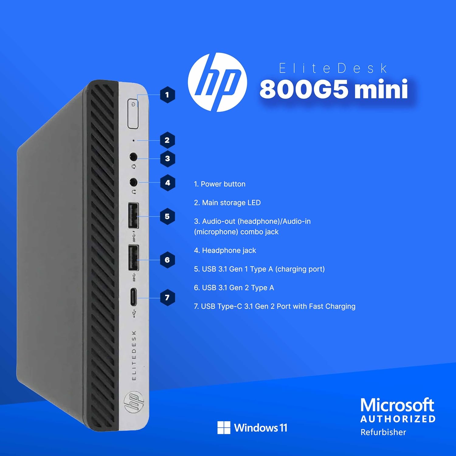 The HP EliteDesk 800 G5 Mini is a refurbished business-class desktop that balances performance, compact design, and cost efficiency. Powered by an Intel Core i7 9th Gen Hexa-Core processor, this ultra-small PC is ideal for home offices, front desks, conference rooms, and tight workspaces. Each unit is configured for dependable performance with 16GB DDR4 RAM and a 500GB NVME M.2, enabling fast boot-up, quick response times, and plenty of storage for apps, documents, and media. Reliable Connectivity & Professional Setup: WiFi & Bluetooth Adapter – Wireless freedom for network access and device connectivity. Windows 11 Pro – Secure, modern, and business-ready operating system. The HP EliteDesk 800 G5 Mini is a refurbished business-class desktop that balances performance, compact design, and cost efficiency. Powered by an Intel Core i7 9th Gen Hexa-Core processor, this ultra-small PC is ideal for home offices, front desks, conference rooms, and tight workspaces. Compact, Flexible, and Efficient Ultra-small footprint – Easily fits on or under desks, or behind monitors with compatible mounts Energy-efficient and quiet – Ideal for focused work environments As a Microsoft Authorized Refurbisher, BlairTech professionally renews each system through rigorous testing and certification. The HP EliteDesk 800 G5 Mini is a smart, sustainable solution for users seeking reliable performance in a compact package