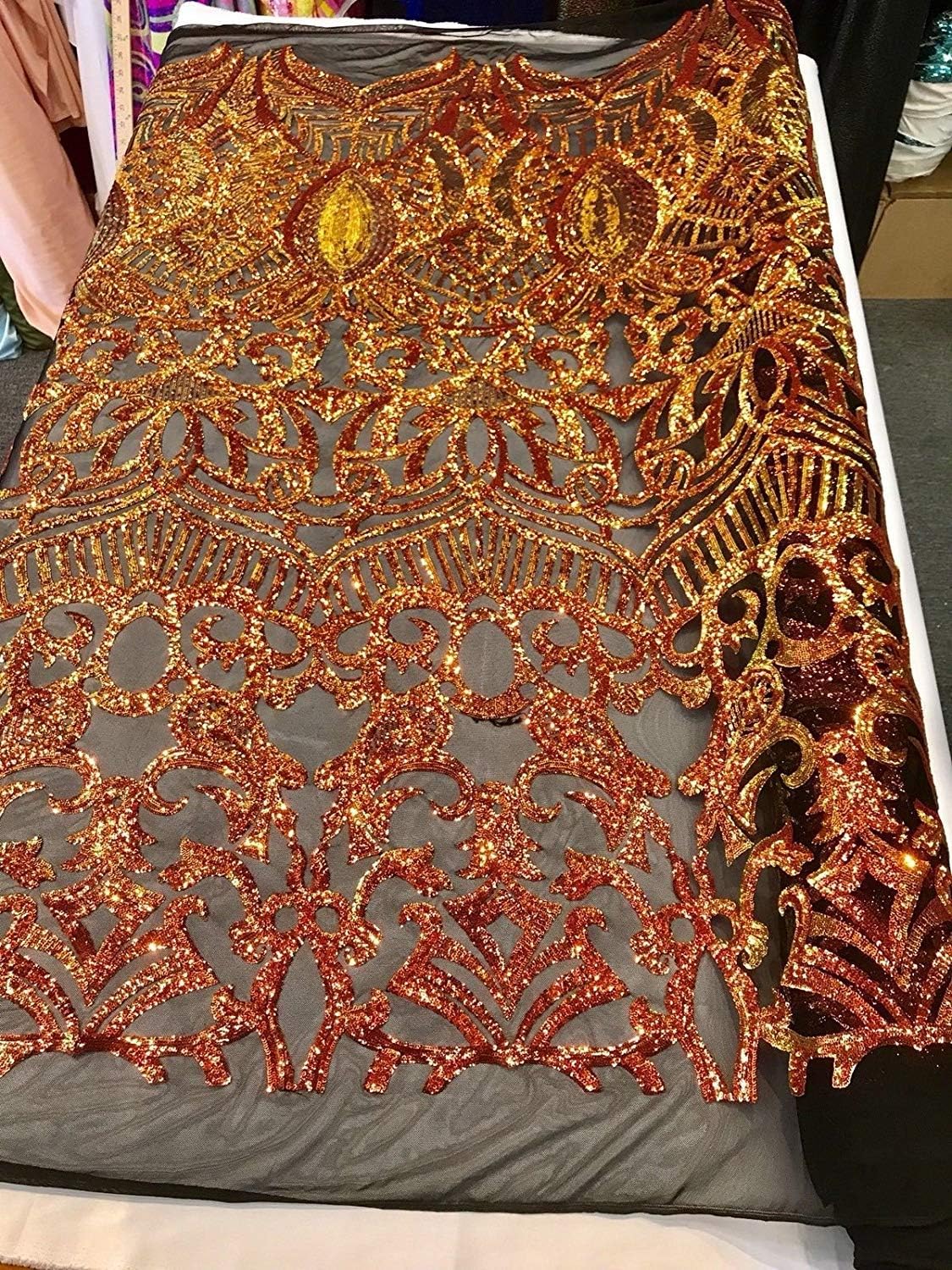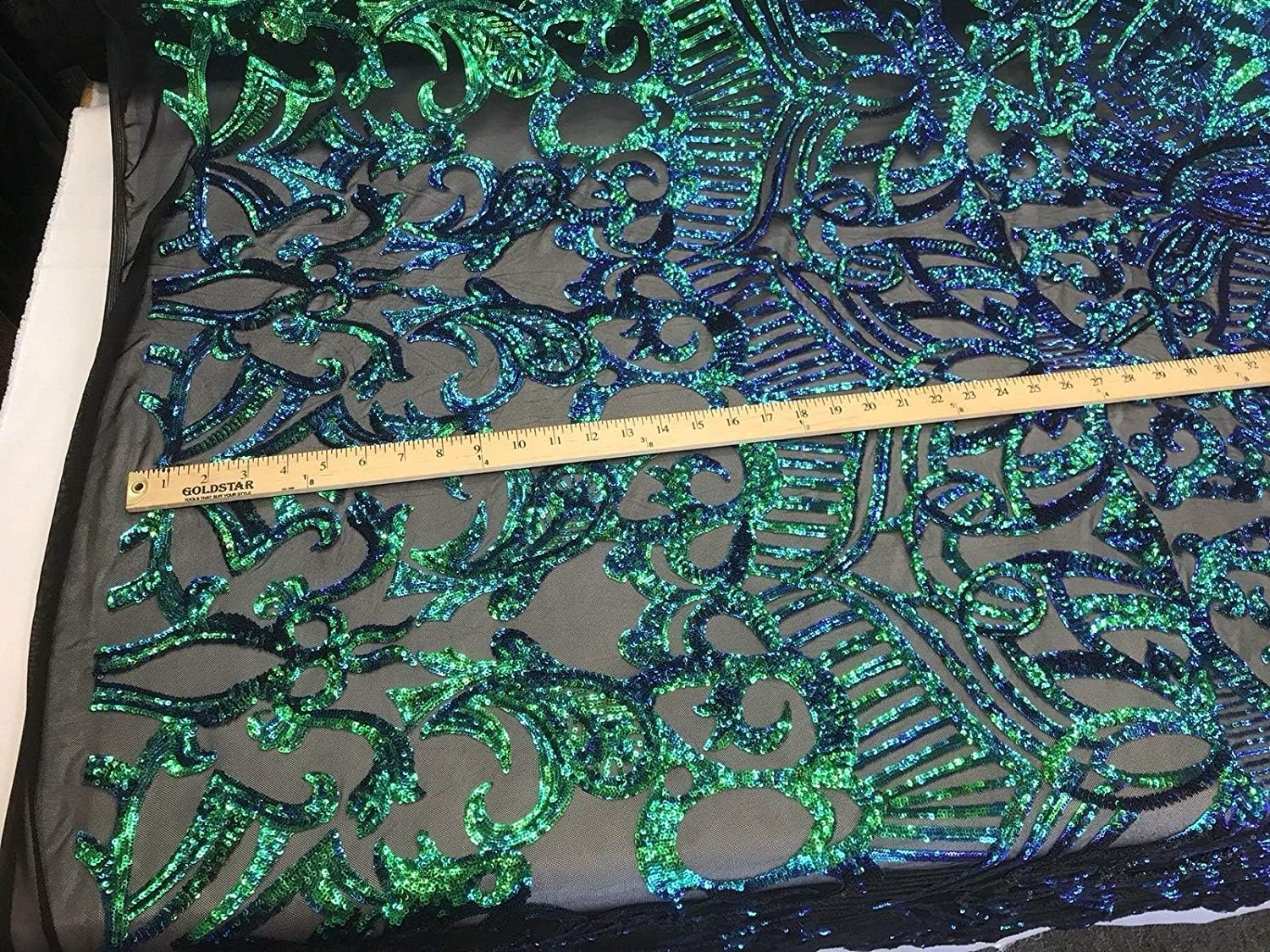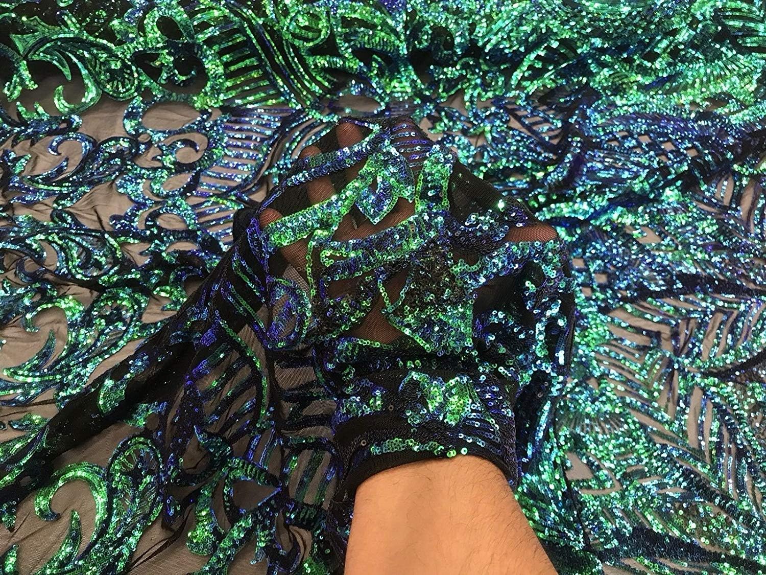 This ROYALTY design is embroidered with iridescent Sequins on a 4 Way Stretch mesh fabric. The iridescent Sequins has especial and extraordinary design on the Mesh . It is super elegant and classy, The royalty design embroider with iridescent Sequins on a mesh can be use for dresses, tablecloths, night gowns, Skirts, prom dresses, wedding dresses, runners for tables,decoration and much more.