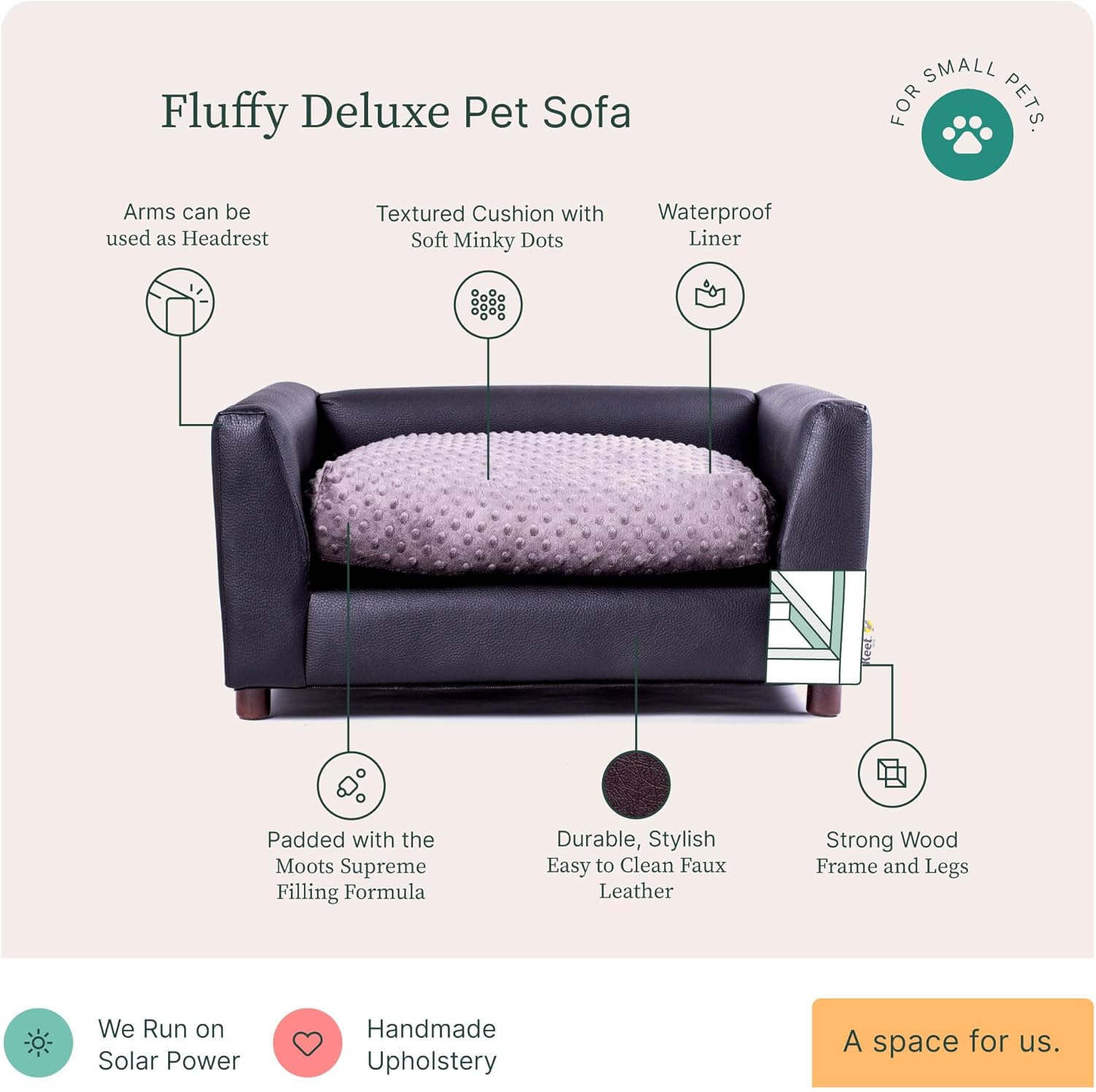 Give your pet the gift of luxury and comfort with the Moots Leatherette Dog Sofa. Designed in California and made in Tijuana, Mexico, this premium couch for dog is thoughtfully crafted to provide long-lasting comfort, durability, and style. Its faux leather upholstery, reinforced with mesh fabric, offers a sophisticated look while ensuring easy maintenance. Dirt and spots are easily cleaned with just a damp cloth, so your dog's favorite spot stays fresh and cozy. We’ve incorporated a heavy-duty zipper with locking sliders to keep playful dogs from tampering with the cushion cover. Beneath the upholstery lies a waterproof layer to protect the filling, ensuring the pet sofa bed couch remains in great shape even during accidents or spills. Inside, Moots' supreme fill formula combines poly-fiber and shredded memory foam, providing your dog with the perfect mix of support and softness. The solid wood frame and legs not only enhance the dog bed sofa durability but also add a touch of elegance to your home. Whether it’s naptime or playtime, your furry friend will love lounging on this beautifully crafted fancy dog bed, and you’ll love how it looks in your living space.
