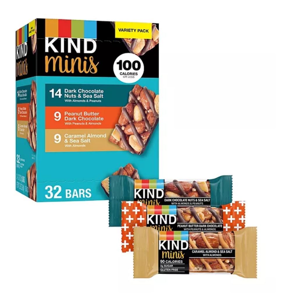 Delicious and Nutritious Snack Bars Enjoy a wholesome treat with the KIND Minis Dark Chocolate Nuts & Sea Salt, Peanut Butter Dark Chocolate, and Caramel Almond & Sea Salt bars snack variety pack. These half-sized versions of the classic KIND bars are packed with almonds or peanuts as the #1 ingredient, offering a perfect balance of sweet and salty flavors. Whether you prefer Dark Chocolate Nuts & Sea Salt, Peanut Butter Dark Chocolate or Caramel Almond & Sea Salt, you can indulge in a portion-controlled format that's perfect for a mini snack or an afternoon pick-me-up. Low Calorie, Low Sodium, and Low Sugar Each of these KIND Minis bars contains 100 calories or less and 3-4 grams of sugar, making them a delicious low sodium snack option. They're a healthy choice when you're craving a sweet treat, but want to stick to your dietary goals. Quality Ingredients The ingredients in these gluten-free bars are kosher and Non-GMO Project Verified. Each flavor has a unique blend of ingredients that contribute to its delicious taste and nutritional value. From almonds and peanuts to honey and sea salt, these bars are made with quality you can trust.