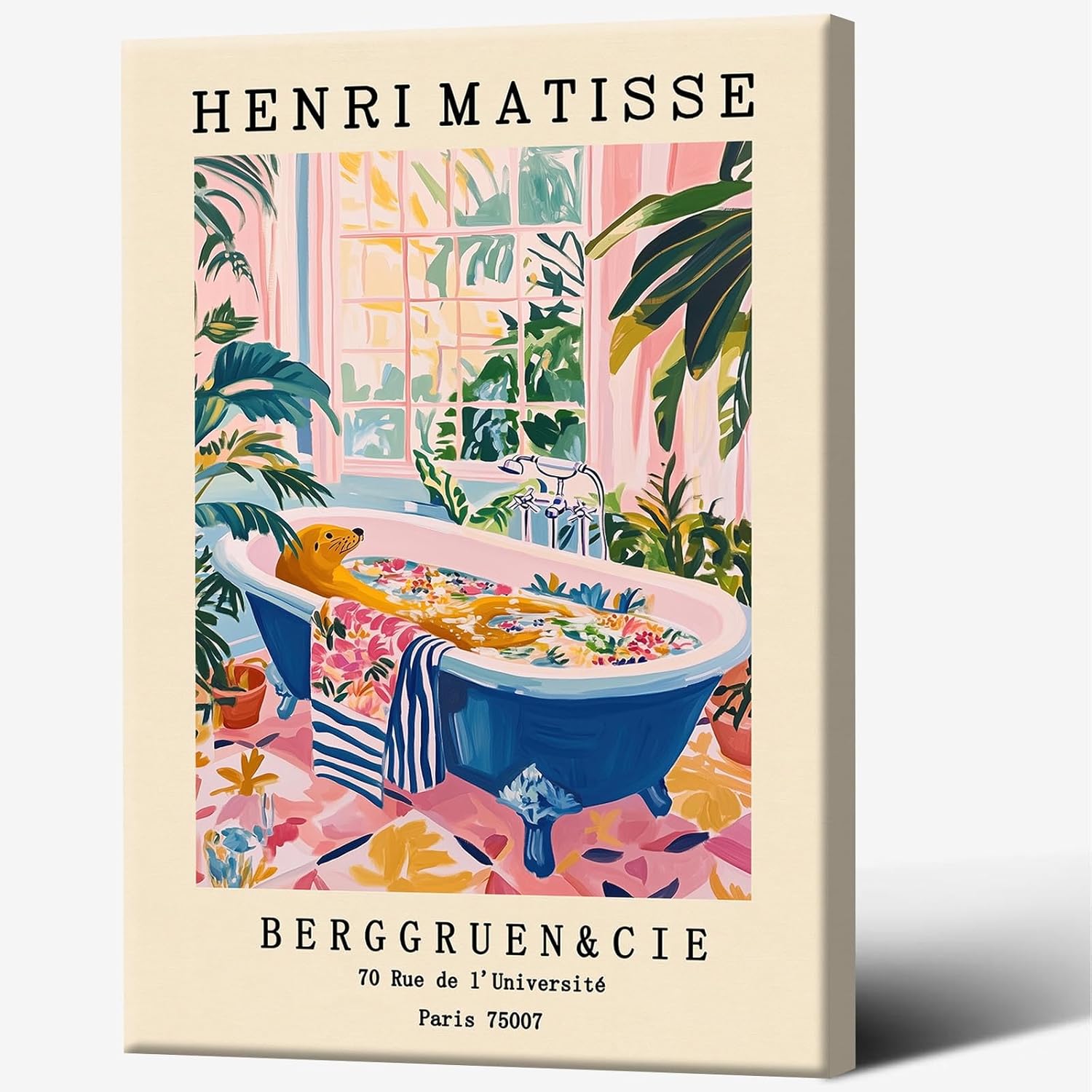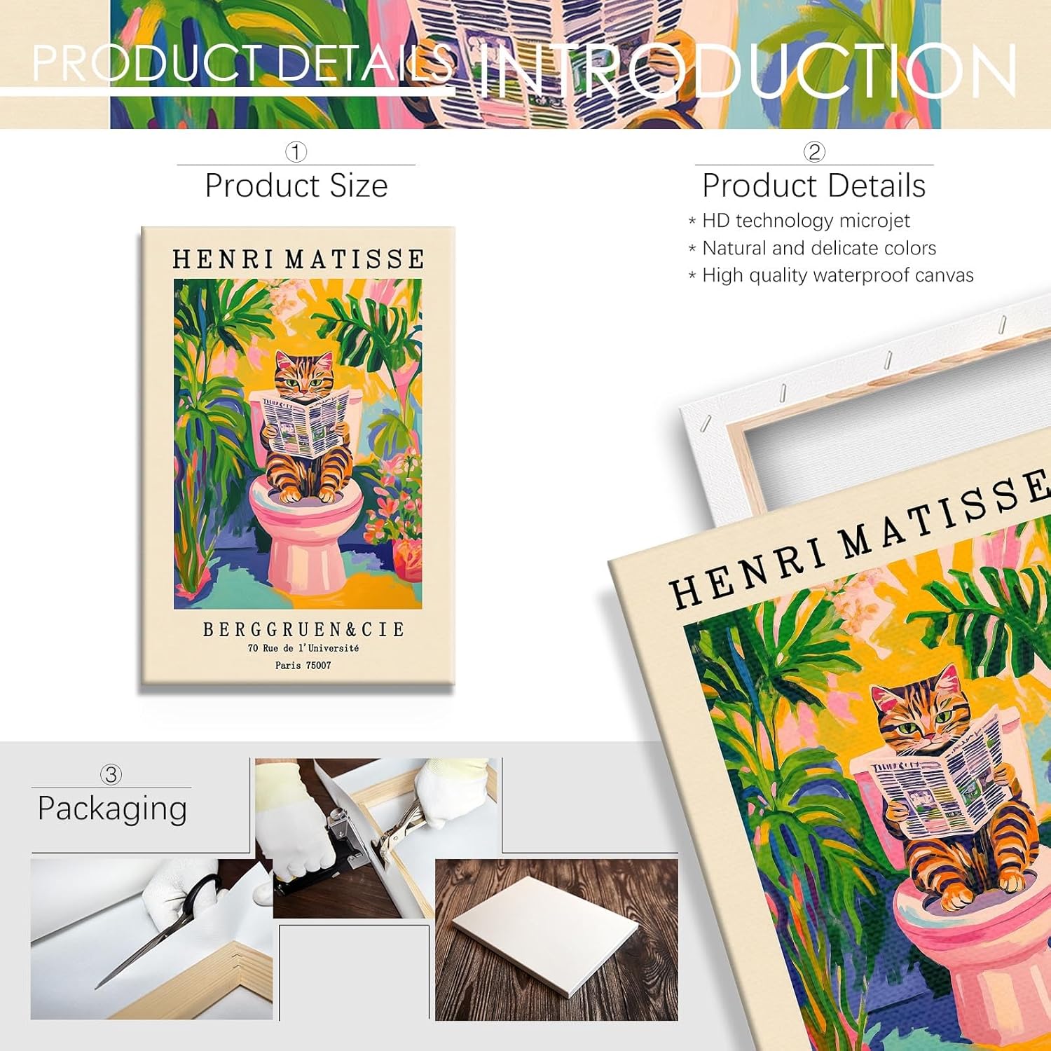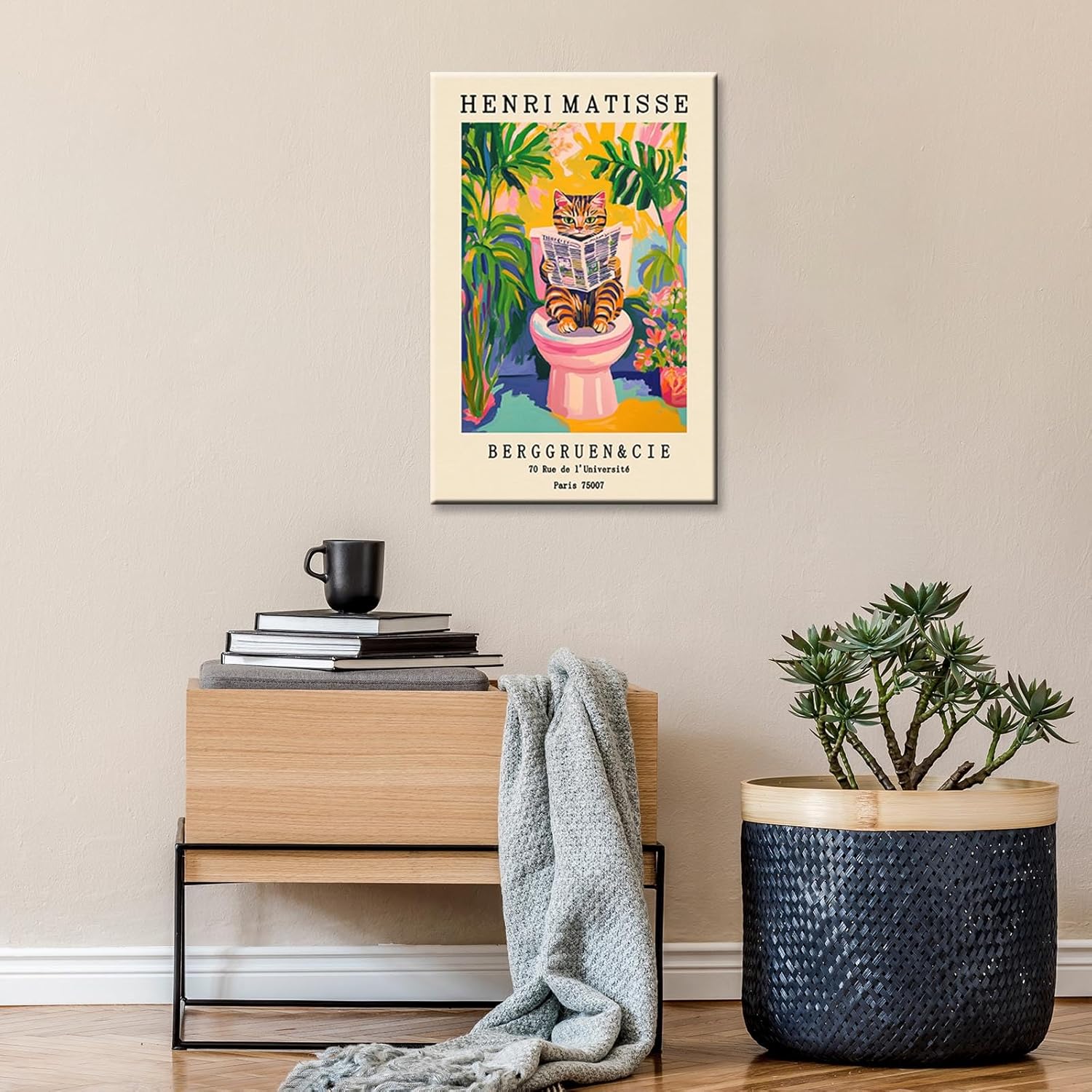 Elevate your bathroom with the perfect blend of artistry and humor—our Vintage Henri Matisse Canvas Wall Art featuring a cute tabby cat on a toilet. Designed to bring a smile to your face every day, this pink dopamine-infused print combines whimsical charm with sophisticated design. Its high-quality canvas construction ensures durability and lasting beauty, while its versatile size fits seamlessly into any bathroom setting.