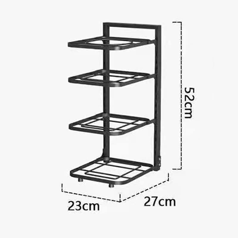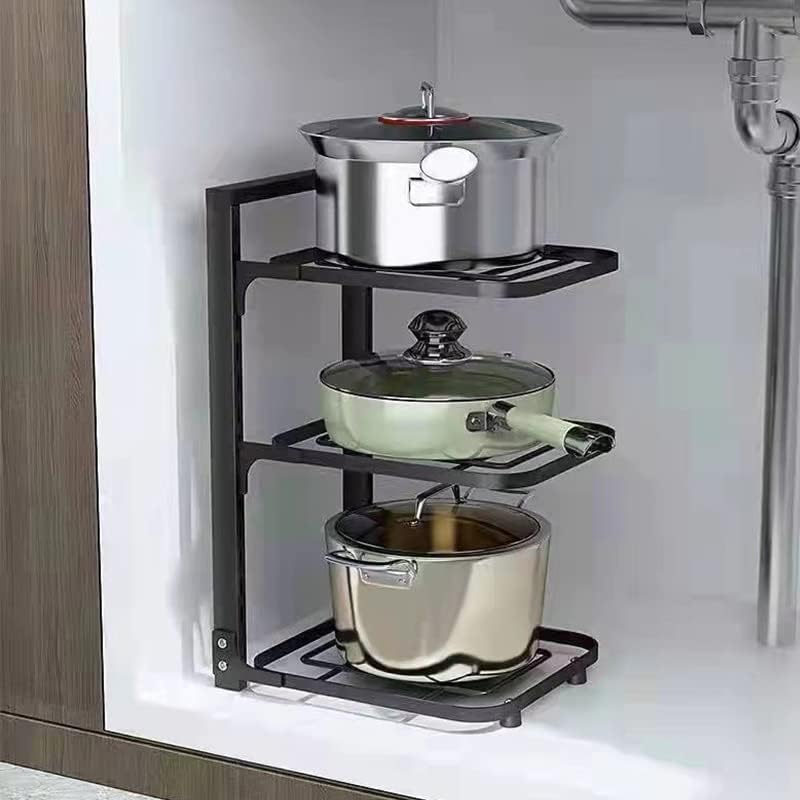Features : Advantages : This pot storage rack adopts layered storage , which can effectively save space , and it has a strong bearing force without worrying about tipping over . Material : This pot storage rack is made of metal material , for long-lasting and avoid corrode , thickened design to resist wear and tear . Detail Introduction : This pot storage rack is designed with buckles , which are sturdy and firm . The rounded corner design will not harm your skin . Thoughtful Design : The layer spacing of the storage rack can be adjusted freely , so you don't have to worry about the cookware too big to fit . Wide Application : Suitable for flat countertops , floors , cabinets , including all neglected spaces , such as the countertop under the sink , corners , etc . Specification : Item Type : Kitchen Storage RackMaterial : MetalPackage List : 1 x Kitchen Storage Rack
