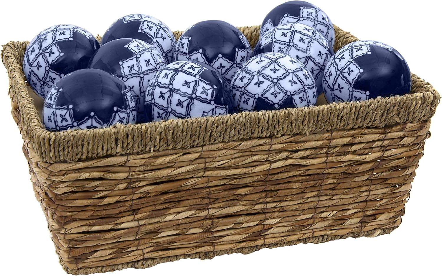 This charming set of ten porcelain spheres is a great choice for a gift or a decorative accent. Each ball features a botanical grid pattern along the circumference with solid blue star designs on opposite poles. Place them on a shelf for display or in a basket for a seasonal centerpiece. Woven rattan display basket is not included.