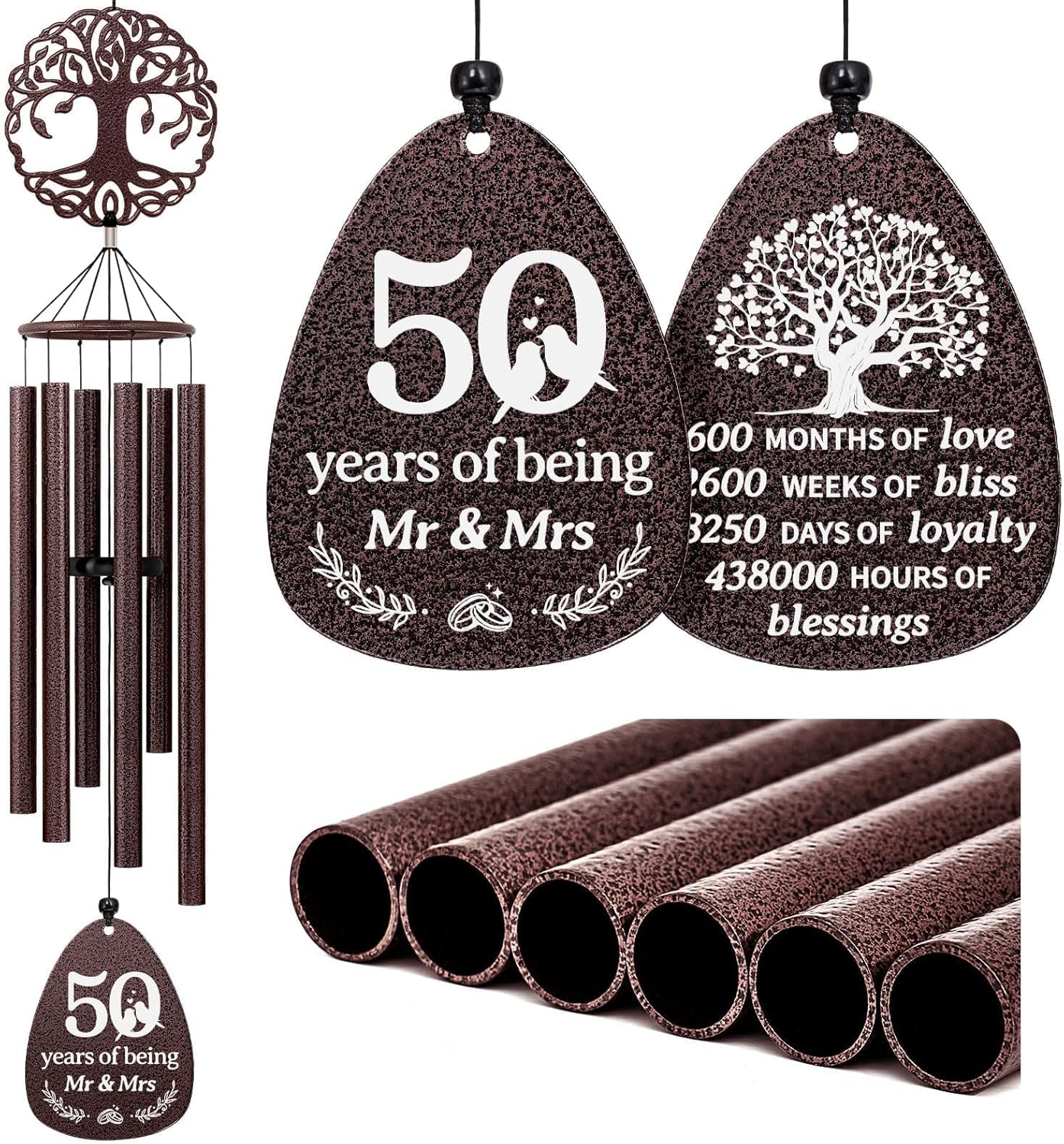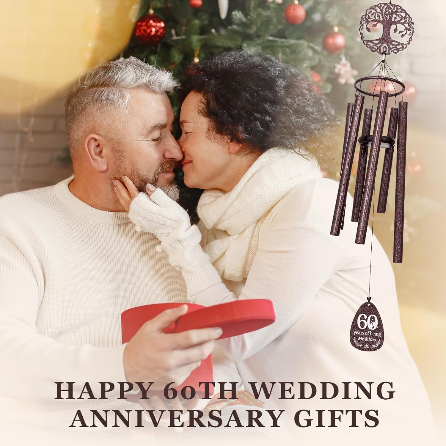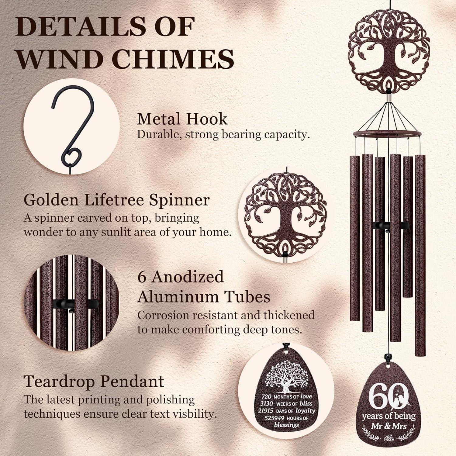 Looking for something special as gift for the 60th wedding anniversary?Remind your beloved one your love story each time the wind chime sings.Idea for hanging in the garden, backyard, patio or any outdoor location, the anniversary wind chimes sing the praises of marriage every time they are rung, making it an extraordinary 60 year anniversary ornament.Overall dimensions: 37 inches from the top of the metal hook to the bottom of the wind chime sail.Wind chime length: 12.6 inchesAluminum tree of life: 4.5 x 4.6 inchesAluminum tag: 3 x 3.9 inches