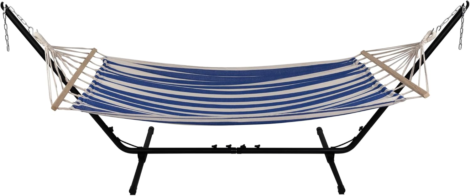 Create unforgettable summer moments with this double hammock! Curl up under the sun or stars with a loved one in this spacious design featuring breezy blue and cream stripes and a stylish macrame touch. Built-in pillows provide extra comfort as you lose yourself in a captivating book, drift off for a relaxing nap, or simply enjoy the gentle sway. Easily hangs between trees, on your deck, or with a hammock stand. Transform your backyard into a summer sanctuary and unwind together! Product Features:. Striped quilted hammock. Color: blue and cream. Comes with braided rope loops and wooden bars for easy hanging and stability. For adults only, adult supervision when in use by children. Hangs best on a metal frame (not included). Recommended for indoor or outdoor use. Does not come with padding Dimensions: Overall dimensions: 108" long x 56" wide. Bed: 77" long x 55" wide. Material(s): polycotton/polyester/wood/metal Note: hammock only - stand and hanging hardware are not included