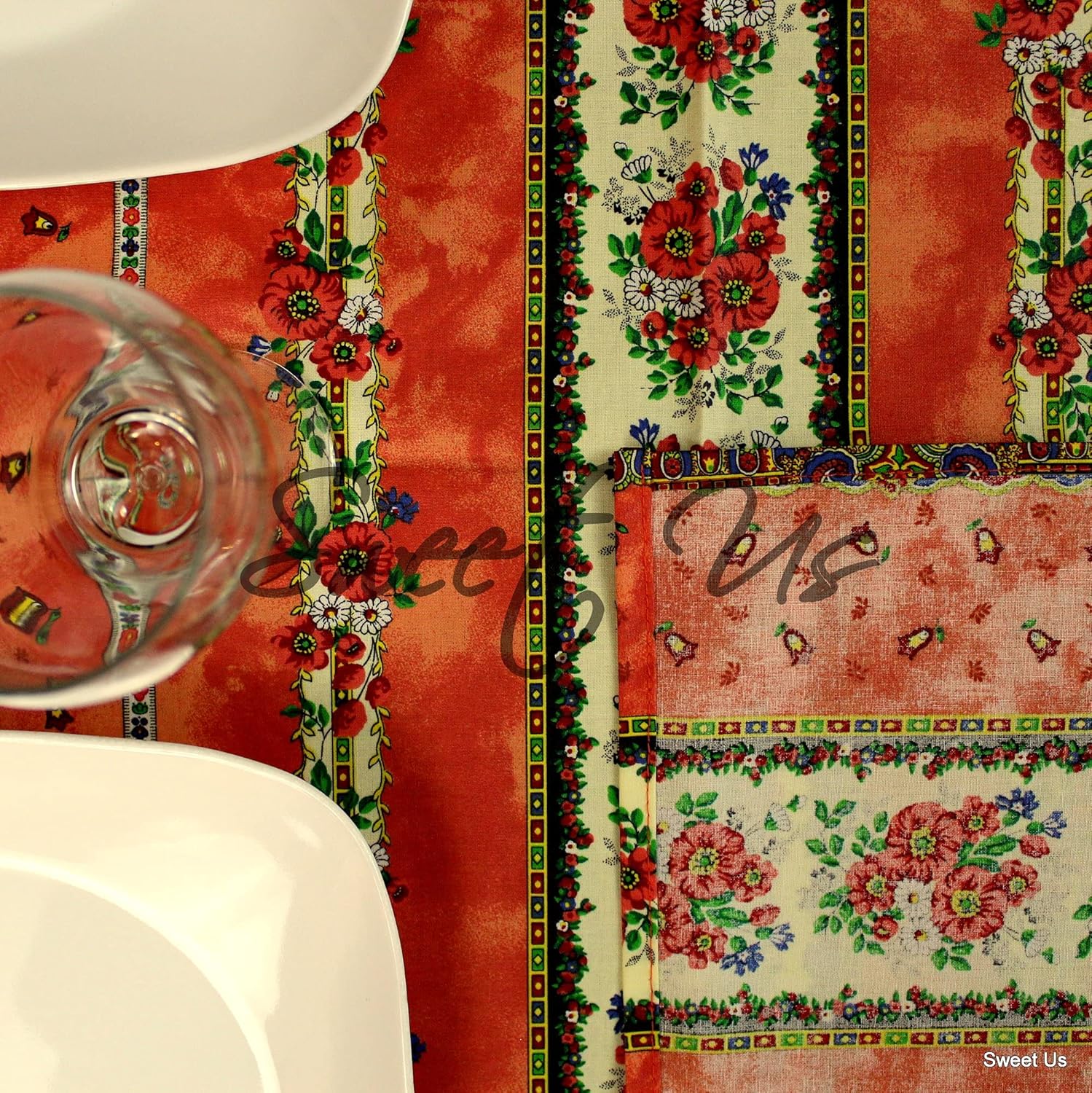 ENHANCE YOUR KITCHEN AND DINING DECOR WITH THIS BEAUTIFULLY HANDCRAFTED TABLECLOTHAn amazing French Provencal tablecloth depicting a cluster of flowers on a salmon peach background. It is not just beautiful but strong & durable. Made of 100% cotton fabric and coated with acrylic fabric protector.STAIN RESISTANT SPILL RESISTANT ACRYLIC COATED PREMIUM FABRIC100% Soft Strong Durable Acrylic Coated Cotton Fabric With Tighter & Smooth Weave That Protects Against Oil and Water Stains, Spills and Color-fadingSAFE AND INCREDIBLE FOR EVERYDAY USE AND SPECIAL OCCASIONSMade in Provence, France Tablecloth are good for picnic, camping, wedding, Birthday party, restaurant, buffet, Easter, Thanksgiving and Christmas dayPERFECT FOR 42, 48 INCH SQUARE TABLE SUITABLE FOR SEATING 4-6 PEOPLEabout 52 x 52 inches SquareSUPER EASY CAREWIPE it off with mild dish washing soap and water. No machine wash. Hand wash Only. No chemicals, bleach or iron.CUSTOMER SERVICE GUARANTEEWe stand behind our products. Please contact us if you have any questions and we will do our best to resolve the issueFine Print: The actual product colors shades may vary slightly from online pictureThis tablecloth is printed, not quilted or woven.The tablecloth is printed on the front side only.The buyer is responsible for paying customs duty or any other charges incurred in the buyer's home country.