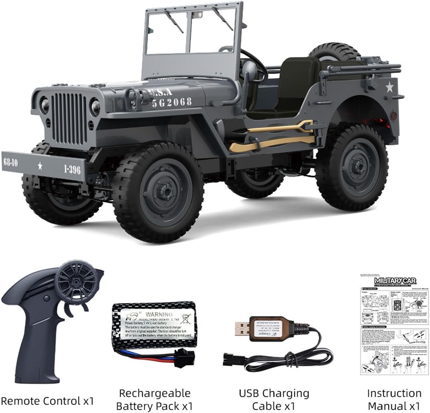 #1/10 Radio Control Off Road Car C8815 4WD RC Crawler Military Truck Model Climbing Vehicle RTR Battery LED Lights 280 Motor #Specification: Manufacturer: Item Condition: New, Painted and Assembled Scale: 1/10 Material: Plastic Car Size: About 34*17.3*15.7CM / 13.4*6.8*6.2Inches Gross Weight: About 0.75KG Car Battery: 7.4V Li-Po (Include) Motor: 280 Brushed Motor Wheelbase: 215MM / 8.5 Inches Track Width: 128MM / 5.0 Inches Wheel Diameter: 75MM / 3.0 Inches Remote Control Distance: About 60 Meters Charging Time: About 2 h Working Time: 30-40 Minutes ID:-C8815-GB7015-RTR-GY #The Package Includes: RC Car Model*1 Car Battery*1 Remote Controller*1 Charging Cable *1 Instruction Book*1 Light System #The Package Does Not Include: Batteries for the Remote Controller (Recommended: AA*2) Sound System