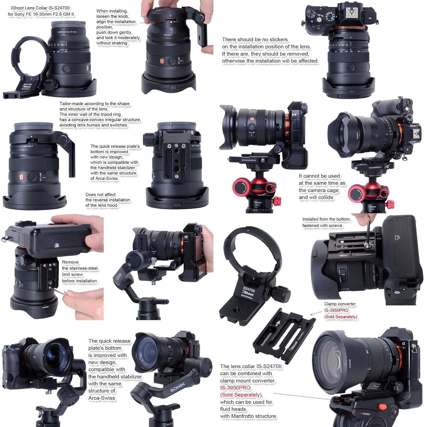 iShoot Lens Collar Tripod Mount Ring IS-S2470II --- Support Vertical Shoot Compatible with Sony FE 24-70mm F2.8 GM II, FE 16-35mm F2.8 GM II & FE 20-70mm F4 G Bottom is 39mm Arca Fit Quick Release Plate Feature Compatible with RRS / ARCA-SWISS Fit Tripod Head Clamp & Arca Fit Stabilizer Main Features: 1. The tripod mount ring is tailor-made according to the shape and structure of the lens. The inner wall of the tripod ring has a concave-convex irregular structure, avoiding lens bumps and switches; only compatible with Sony FE 24-70mm F2.8 GM II, FE 16-35mm F2.8 GM II & FE 20-70mm F4 G Lens, Not Compatible with Sony FE 24-70mm F2.8 GM lens; 2. The lens collar IS-S2470II can be combined with clamp mount converter IS-3950PRO (Sold Separately), which can be used for fluid heads and Stabilizer with Manfrotto 50 structure; 3. The tripod ring is made of Aviation Aluminum, CNC precisely machined, hollow-out weight reduction design, polished and surface anodized finish. The appearance and exquisite workmanship are much better than similar products made by mold. Compatible with Sony Lens: FE 16-35mm F2.8 GM II FE 20-70mm F4 G FE 24-70mm F2.8 GM II Not compatible with Sony FE 24-70mm F2.8 GM lens. Tips: There should be no stickers on the installation position of the lens. If there are, they should be removed, otherwise the installation will be affected. Package Includes: 1 x iShoot Tripod Mount Ring IS-S2470II Compatible with Sony FE 24-70mm F2.8 GM II Lens (Note: The other items in the photos not listed here are for illustrating only, not included)