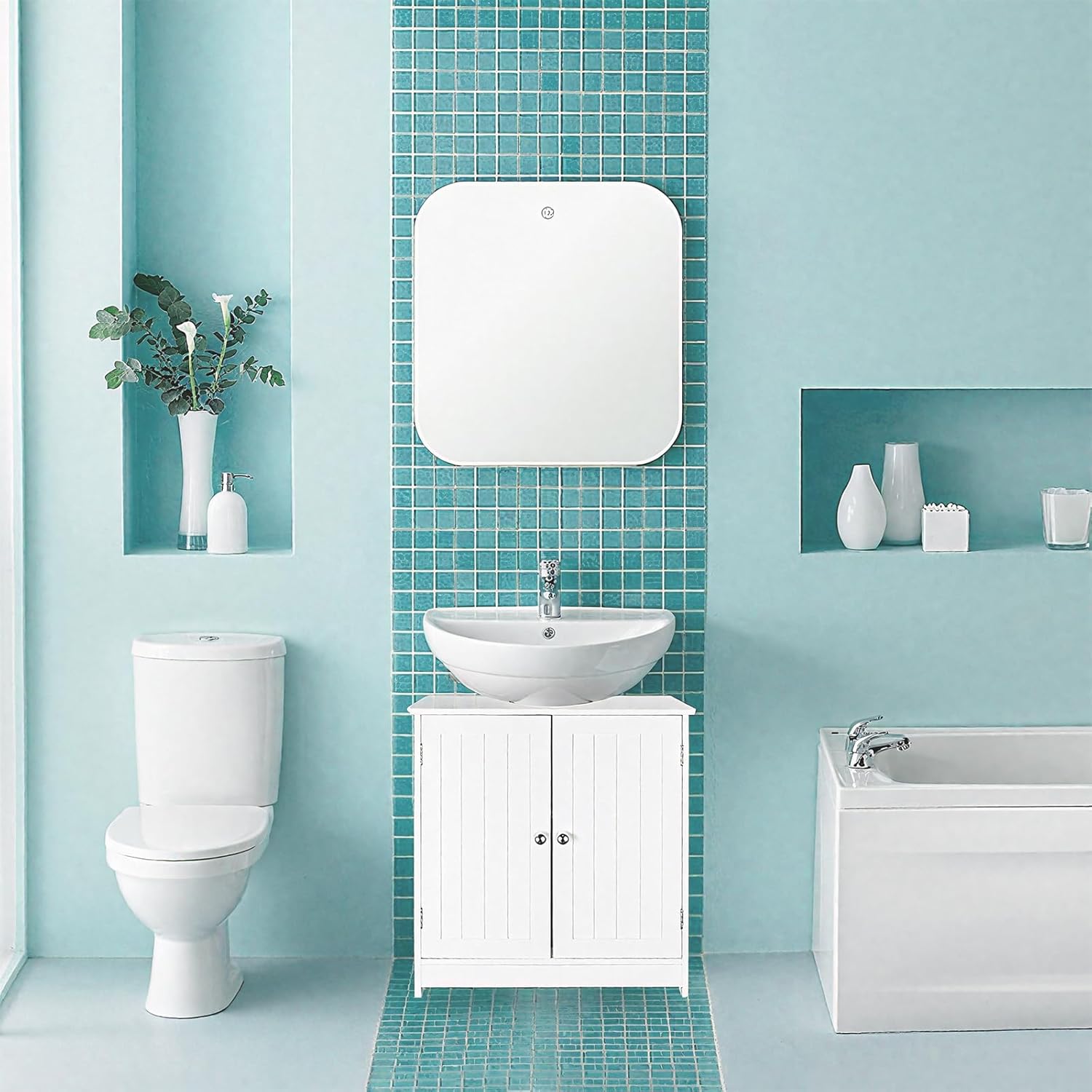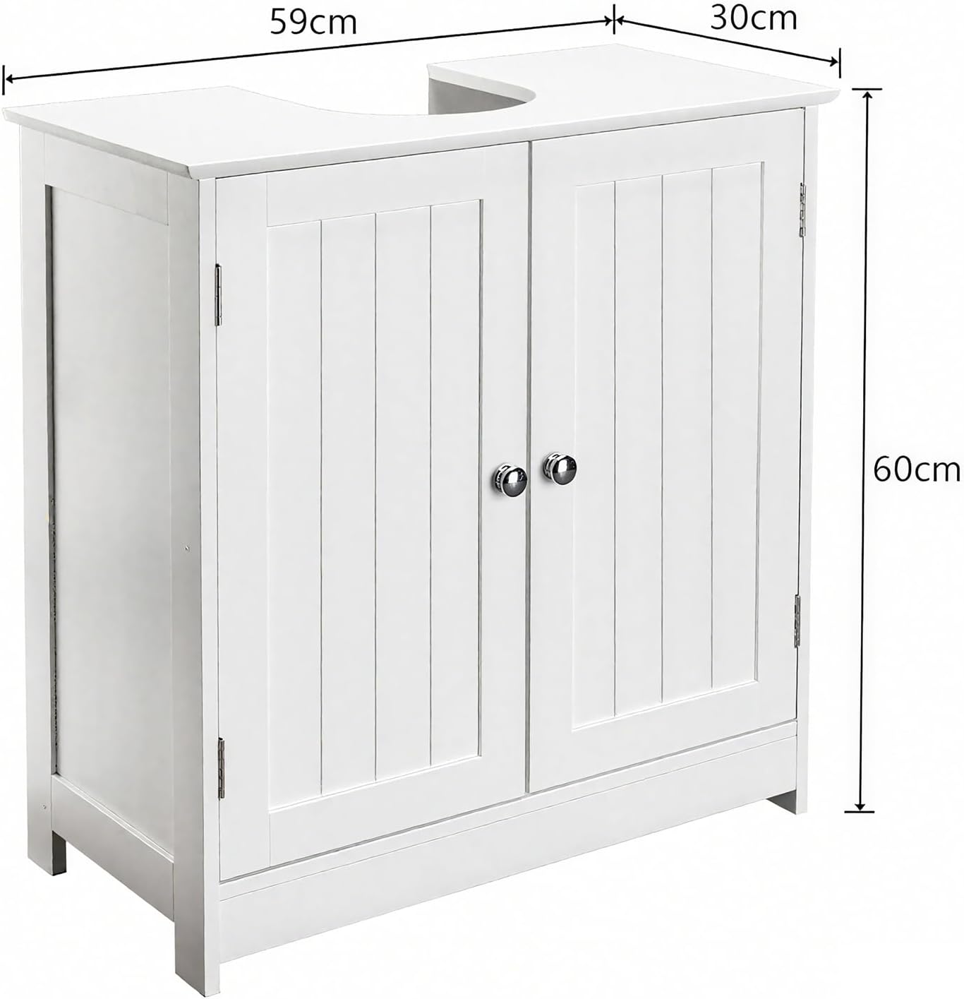 Maximize Your Bathroom Storage!Discover the perfect storage solution with our white Under Sink Bathroom Cabinet. Designed to fit neatly under most standard sinks, this freestanding cabinet provides smart organization for any bathroom space. Crafted from moisture-resistant MDF with a sleek white finish, it combines functionality with style to keep your bathroom clutter-free.Perfect For Seasonal OrganizationAs we enter the fall organization season, this cabinet offers an ideal way to refresh your bathroom space. The clever design features two slatted doors with internal shelves, providing concealed storage while promoting air circulation. Measuring 23.6"L x 11.4"W x 23.6"H, it's the perfect size for under-sink placement while offering substantial storage capacity.Key Benefits: Optimal Pedestal Sink Storage: Specifically designed as under pedestal sink storage solution Ample Organized Space: Internal shelves keep bathroom essentials neatly stored Durable Construction: Water-resistant MDF stands up to humid environments Versatile Placement: Freestanding design requires no installation Elegant Design: Clean white finish complements any decor style Easy Assembly: Simple setup with included instructionsSpecifications: Color: White Material: MDF Dimensions: 23.6" x 11.4" x 23.6" Weight: 24.25 lbsPackage Includes:1x Bathroom Cabinet1x Instruction ManualUpgrade your bathroom organization with this practical and stylish storage solution. Perfect for keeping toiletries, cleaning supplies, and bathroom essentials neatly organized and out of sight.Add to Cart today and transform your bathroom space!