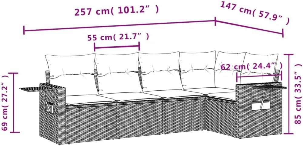 This garden sofa set is a great addition to your backyard, terrace, or patio, providing a comfortable and inviting space for chatting with family and friends or simply relaxing and enjoying the outdoors.Durable material: PE rattan, also known as poly rattan, is a strong, low-maintenance synthetic material that looks like natural rattan. It's lightweight, easy to clean, and commonly used for outdoor furniture due to its durability and weather-resistant properties. Convenient side table: This outdoor furniture features foldable side tables with a gas spring on the armrests, providing convenient spots to keep your essentials within easy reach. Comfortable seat experience: This outdoor furniture, complete with thickly padded cushions, offers a comfortable seating experience. Removable and washable cover: These seat cushions feature removable covers for easy washing and maintenance.Modular design: This outdoor furniture set has a modular design, making it completely flexible and easy to move around, so you can create a customized outdoor furniture arrangement. Good to know:To make sure your outdoor furniture stays beautiful, we recommend protecting it with a waterproof cover.Maximum load capacity (per seat): 242.5 lbUV-resistantAssembly required: YesCorner seat:Color: BlackMaterial: PE rattan, powder-coated steelDimensions: 24.4" x 24.4" x 27.2" (W x D x H)Seat size: 21.7" x 21.7" (W x D)Seat height from the ground: 14.6"Center seat:Color: BlackMaterial: PE rattan, powder-coated steelDimensions: 21.7" x 24.4" x 27.2" (W x D x H)Seat size: 21.7" x 21.7" (W x D)Seat height from the ground: 14.6"Arm sofa:Color: BlackMaterial: PE rattan, powder-coated steel