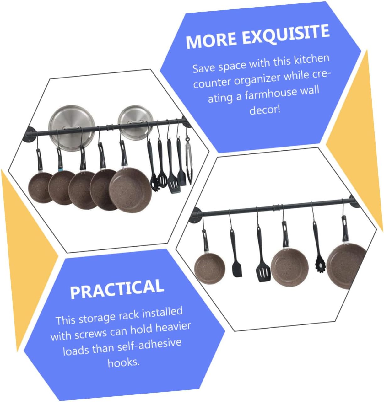 Package List 2 x rods 2 1 x connector 2 x bases 8 x screws 8 x expansion tubes 6 x hooks Features -Product Info:Pot lid stand - Size: 60.00X13.00X5.00cm/23.58X5.11X1.97 inch. - Color: Black. - Material: Iron. - This storage rack installed with screws can hold heavier loads than self-adhesive hooks kitchen utensil hanging rack. - Save space with this kitchen counter organizer while creating a farmhouse wall decor! pot storage rack - Manufactured with premium iron material, and practical enough to use. - It can be used in bathroom to store towels and other items and in kitchen to store various kitchenware wall mounted pan holder. - This kitchen storage rail is outstanding with its durability and well-construction that prevents the hooks from falling off pot hanger.Goods Informationwall mounted kitchen cutlery rack This storage rack installed with screws can hold heavier loads than self-adhesive hooks.hanging rack for kitchen utensils It can be used in bathroom to store towels and other items and in kitchen to store various kitchenware.Hanging Utensil Holder Rack This is a storage rack, which is manufactured with premium iron material, and practical enough to use