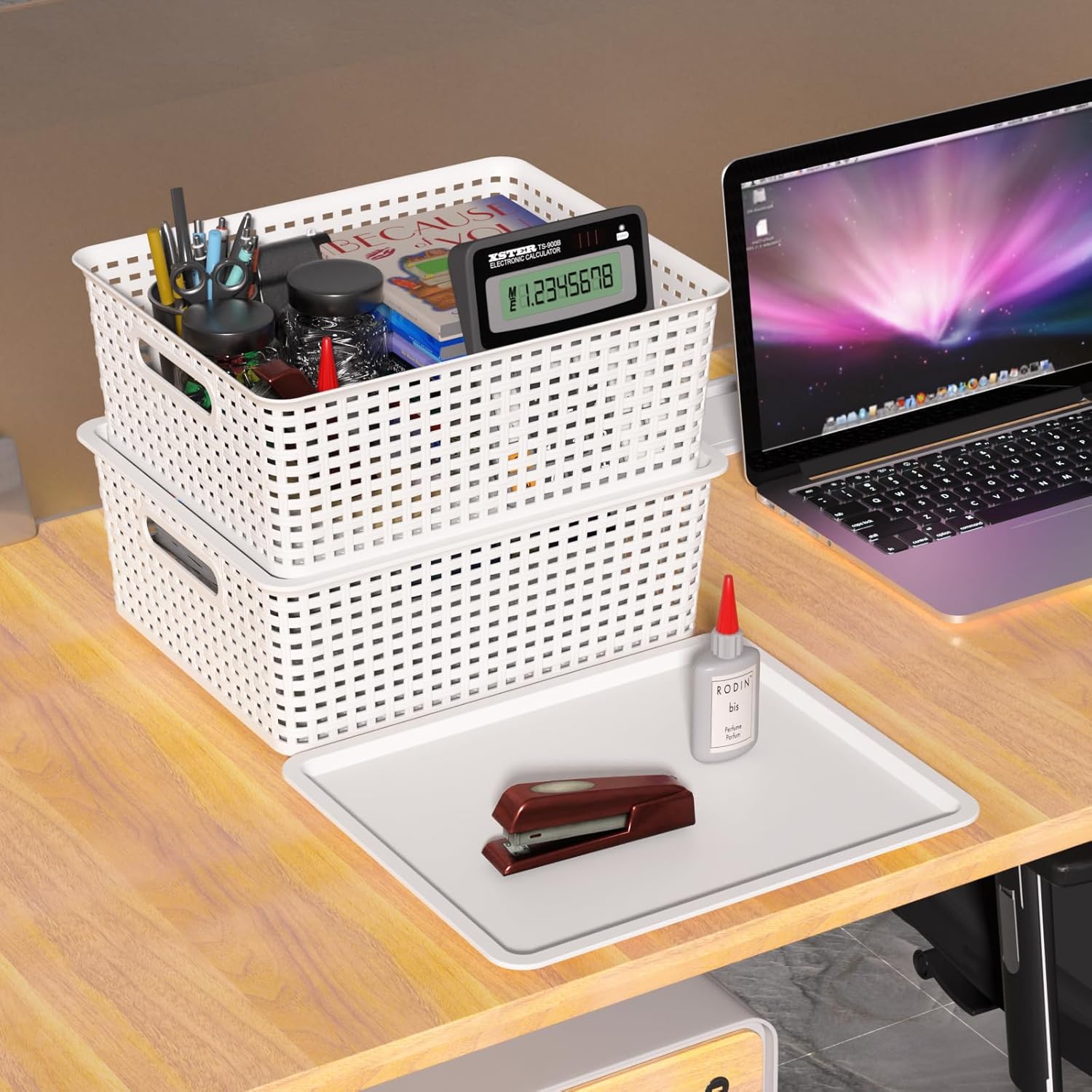Wekioger 6 pack white plastic woven storage basekts with lids, dimensions: 14.1" by 11.7" by 5.3", these basekts are perfect for organizing items on desktops, tabletops, countertops, shelves, washstands, and so on.