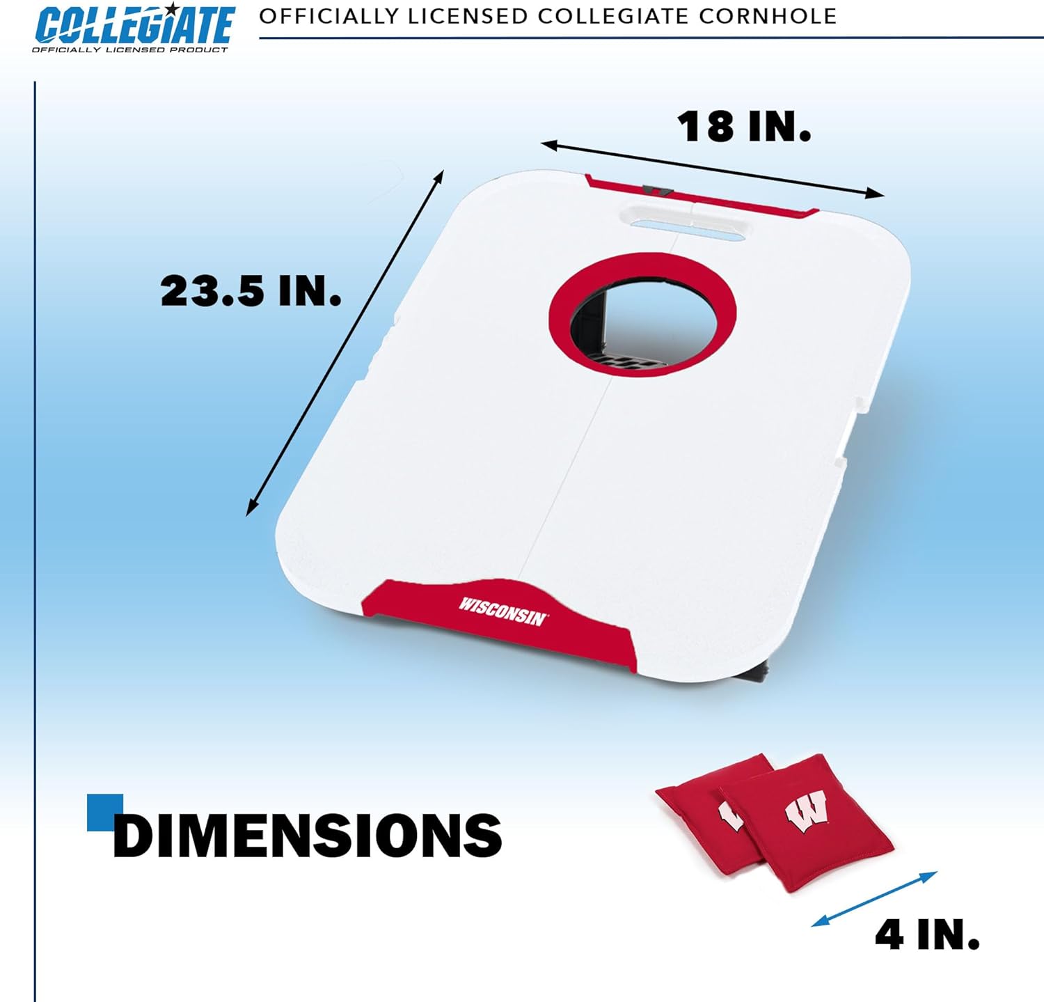 Get in on the cornhole action with the Officially Licensed Collegiate Travel Cornhole Set, the ultimate addition to any NCAA fan's collection. This set includes two All-Weather Cornhole Boards featuring your favorite NCAA school and offers durability and style that hold up in all weather conditions. With the integrated bean bag return system and storage compartments, setup and cleanup are a breeze, ensuring more time for fun. Its portable design, complete with carrying handles and foldable boards, makes transportation effortless, perfect for impromptu games at the park or backyard. So, whether you're hitting a tailgate party or taking the family to the beach, this cornhole set is the ideal set for players of all skill levels and is always ready for action. Get ready to toss, score, and win with the Officially Licensed Collegiate Cornhole Set, a must-have for any NCAA fan’s outdoor adventures.