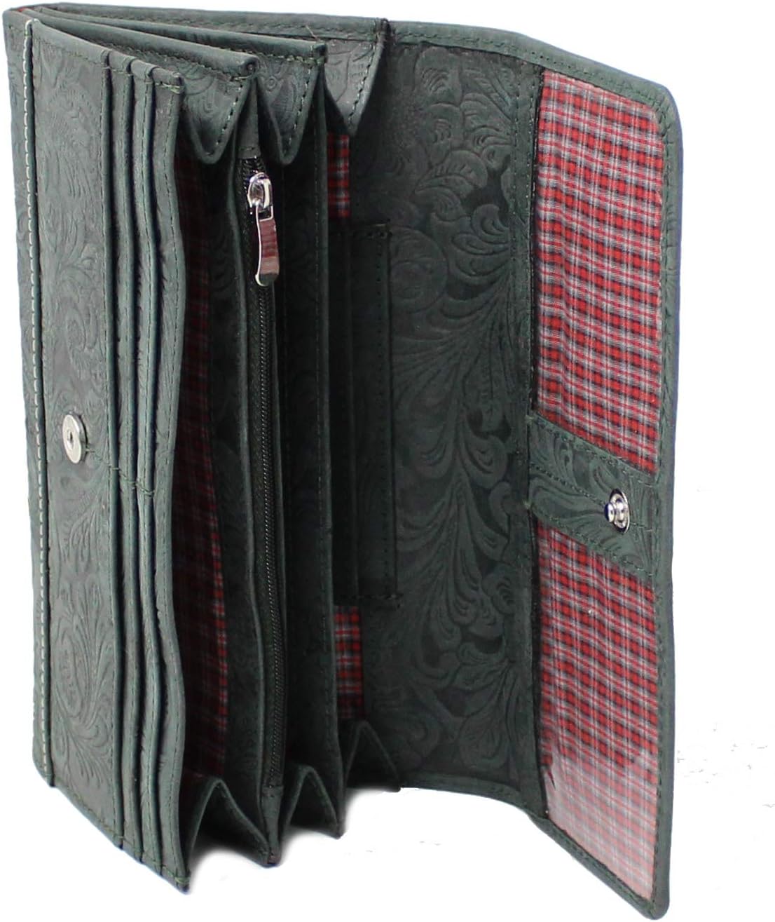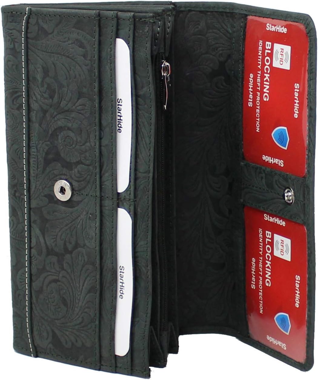 This beautiful green / grey embossed floral leather purse for women by StarHide is made from Premium quality top grain leather for durability and a luxury feel. StarHide wallets are equipped with advanced RFID Secure technology by using unique military grade proprietary blocking material and made of 100% top quality genuine leather from the heritage of the craftsmanship. Each compartment of the ladies purse is RFID protected, shielding all your cards to ensure maximum protection. Each wallet comes in an attractive branded gift box, which makes it a perfect present for special occasions. Why use a RFID wallet? The information on cards with RFID is vulnerable to theft from nearby people with RFID readers to scan and capture information on RFID cards without ever physically coming in contact (similar to scanning a barcode). RFID wallets protect cards from unknown scanning with the unique protective layering crafted inside the wallets lining. Specifications: Holds up to 9 Credit / Debit cards. 2 ID card display windows to hold your ID card or driver license. 2 Full-length compartment for banknotes with a divider. 1 Pocket that can hold a mobile phone up to 6”. 1 Slip-in pouches for receipts / train tickets / bus pass. 1 zipped coin pocket. 1 Zipped pocket on the back of the purse for storing House keys / Car keys. Neat contrast and clean stitching inside and out. Size: 20.5cm (Length) x 10.5cm (Height) x 2.8cm (Width). Net Weight: 172 grams. Warranty: Our 12 Months Warranty enables you a risk free purchase! If for any reason you are not entirely satisfied, please feel free to contact us.