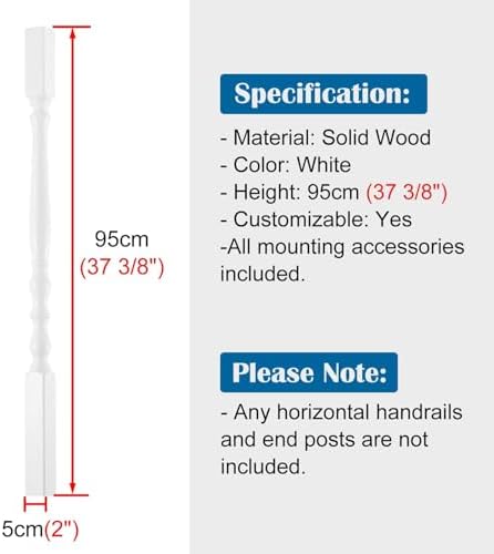 Enhance your outdoor spaces with our premium wood balusters, designed to elevate the look of your deck or staircase while offering long-lasting durability. Crafted from solid wood, these balusters are perfect for both indoor and outdoor settings, ensuring they seamlessly blend with any design aesthetic. **Specifications:** - **Material:** Solid Wood - **Color:** White - **Height:** 95cm (37 3/8") - **Width:** 5x5cm (2x2") - **Customizable:** Yes **Key Features:** - **Versatile Sizing:** Our balusters can be easily cut to fit your specific dimensions, allowing for personalized installation. - **Aesthetic Appeal:** With a clean and elegant design, these balusters enhance the visual charm of your home while maintaining a strong presence. - **Safety and Security:** They provide an additional layer of safety for your family, making them ideal for homes with children or pets. - **Durable Construction:** Made from sturdy solid wood, these balusters are built to withstand the elements and provide lasting strength. - **Easy Maintenance:** The smooth, burr-free surface ensures effortless cleaning and upkeep, keeping your home looking its best. **Package Includes:** - Stair Balusters - Mounting Screws **Please Note:** - Horizontal handrails and end posts are not included. - Slight dimension variations may occur due to manual measurements. - Colors may vary slightly due to lighting and screen settings. **Quality Service:** We are committed to your satisfaction. If you encounter any issues with our product, please reach out to us for assistance. Transform your home and enjoy the perfect blend of beauty and functionality with our wood balusters.